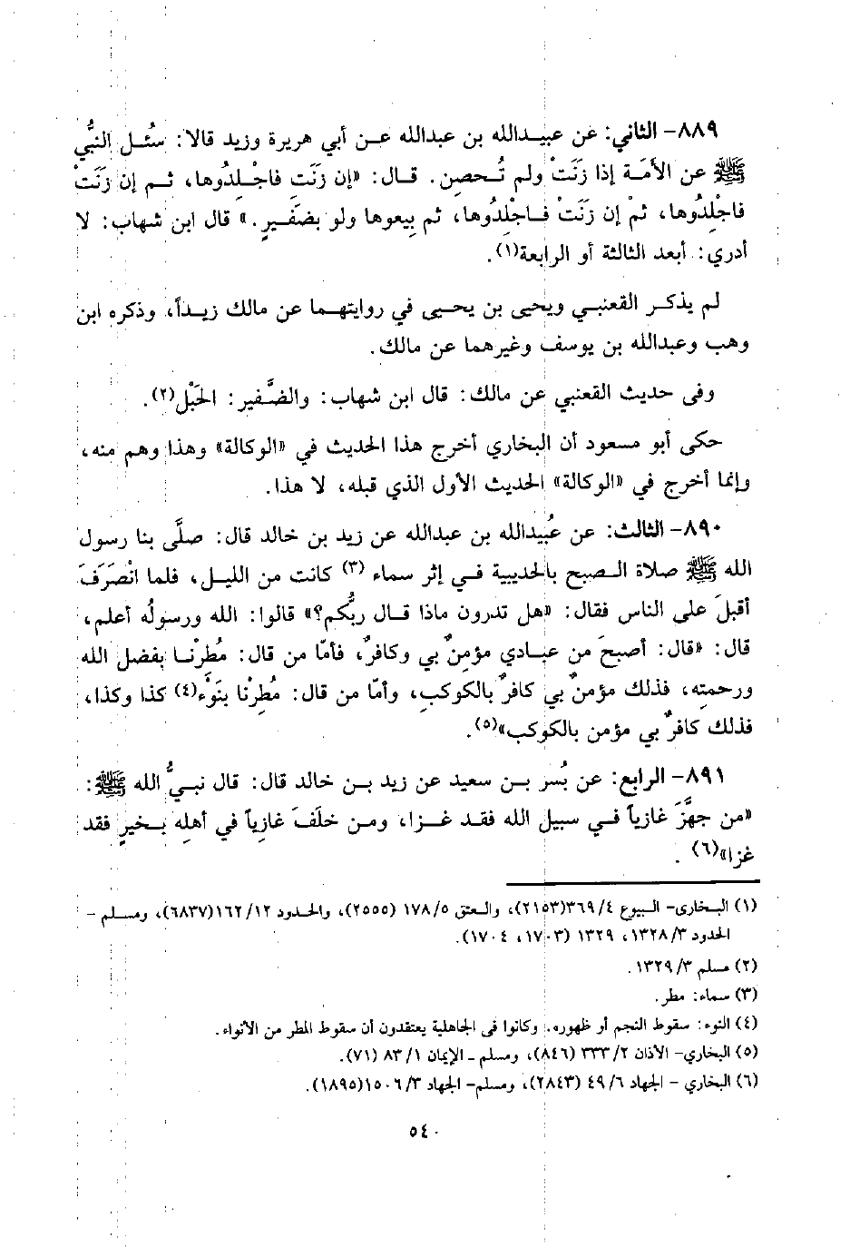 890 - الثَّالِث: عَن عبيد الله بن عبد الله عَن زيد بن خَالِد قَالَ: صلى بِنَا رَسُول الله صلى الله عَلَيْهِ وَسلم صَلَاة الصُّبْح بِالْحُدَيْبِية فِي إِثْر سَمَاء كَانَت من اللَّيْل، فَلَمَّا انْصَرف أقبل على النَّاس فَقَالَ: " هَل تَدْرُونَ مَاذَا قَالَ ربكُم؟ " قَالُوا: الله وَرَسُوله أعلم، قَالَ: " قَالَ: أصبح من عبَادي مؤمنٌ بِي وكافرٌ، فَأَما من قَالَ: مُطِرْنَا بِفضل الله وَرَحمته، فَذَلِك مؤمنٌ بِي كافرٌ بالكوكب، وَأما من قَالَ: مُطِرْنَا بِنَوْء كَذَا وَكَذَا، فَذَلِك كافرٌ بِي مُؤمن بالكوكب ".