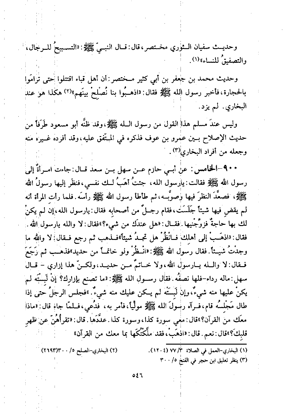 900 - الْخَامِس: عَن أبي حَازِم عَن سهل بن سعد قَالَ: جَاءَت امرأةٌ إِلَى رَسُول الله صلى الله عَلَيْهِ وَسلم فَقَالَت: يَا رَسُول الله، جِئْت أهب لَك نَفسِي، فَنظر إِلَيْهَا رَسُول الله صلى الله عَلَيْهِ وَسلم، فَصَعدَ النّظر فِيهَا وَصَوَّبَهُ، ثمَّ طأطأ رَسُول الله صلى الله عَلَيْهِ وَسلم رَأسه. فَلَمَّا رَأَتْ الْمَرْأَة أَنه لم يقْض فِيهَا شَيْئا جَلَست، فَقَامَ رجلٌ من أَصْحَابه فَقَالَ: يَا رَسُول الله، إِن لم يكن لَك بهَا حاجةٌ فزوجنيها. فَقَالَ: " هَل عنْدك من شَيْء؟ " فَقَالَ: لَا وَالله يَا رَسُول الله.