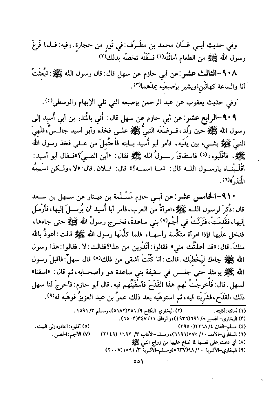 909 - الرَّابِع عشر: عَن أبي حَازِم عَن سهل قَالَ: أُتِي بالمنذر بن أبي أسيد إِلَى رَسُول الله صلى الله عَلَيْهِ وَسلم حِين ولد، فَوَضعه النَّبِي صلى الله عَلَيْهِ وَسلم على فَخذه وَأَبُو أسيد جالسٌ، فلهي النَّبِي صلى الله عَلَيْهِ وَسلم بِشَيْء بَين يَدَيْهِ، فَأمر أَبُو أسيد بِابْنِهِ فَاحْتمل من على فَخذ رَسُول الله صلى الله عَلَيْهِ وَسلم، فأقلبوه، فاستفاق رَسُول الله صلى الله عَلَيْهِ وَسلم فَقَالَ: " أَيْن الصَّبِي؟ " فَقَالَ أَبُو أسيد: أقلبناه يَا رَسُول الله قَالَ: " مَا اسْمه؟ " قَالَ: فلَان. قَالَ: " لَا، وَلَكِن اسْمه الْمُنْذر ".