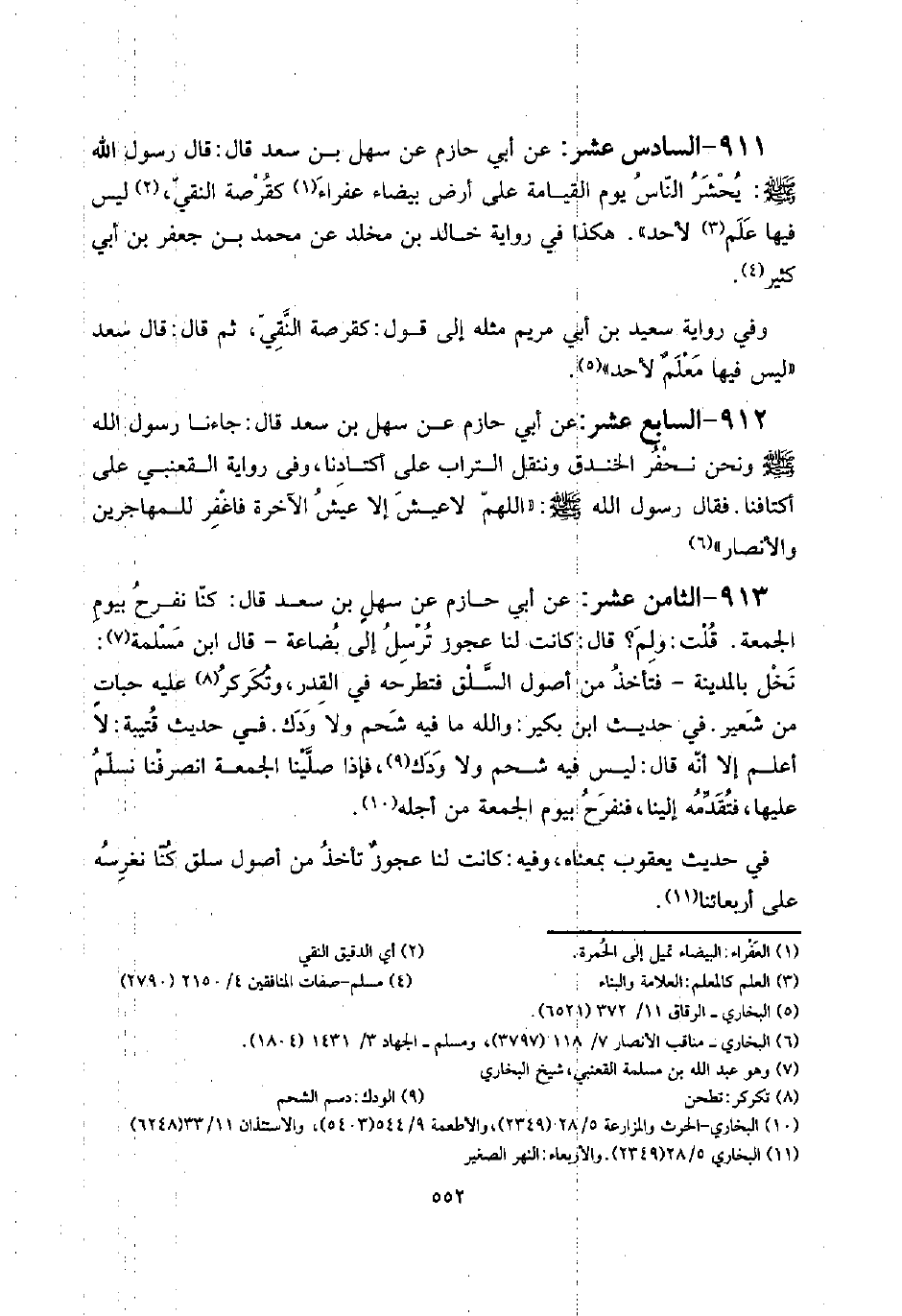 911 - السَّادِس عشر: عَن أبي حَازِم عَن سهل بن سعد قَالَ: قَالَ رَسُول الله صلى الله عَلَيْهِ وَسلم: يحْشر النَّاس يَوْم الْقِيَامَة على أَرض بَيْضَاء عفراء كقرصة النقي، لَيْسَ فِيهَا علم لأحد ". هَكَذَا فِي رِوَايَة خَالِد بن مخلد عَن مُحَمَّد بن جَعْفَر بن أبي كثير.
