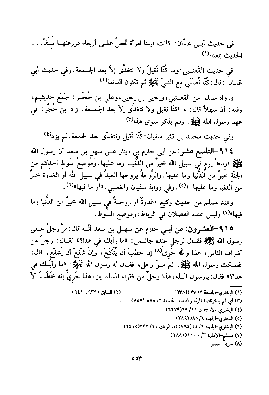 أَن سهلاً قَالَ: ماكنا نقِيل وَلَا نتغدى إِلَّا بعد الْجُمُعَة. زَاد ابْن حجر: فِي عهد رَسُول الله صلى الله عَلَيْهِ وَسلم. وَلم يذكر سوى هَذَا.