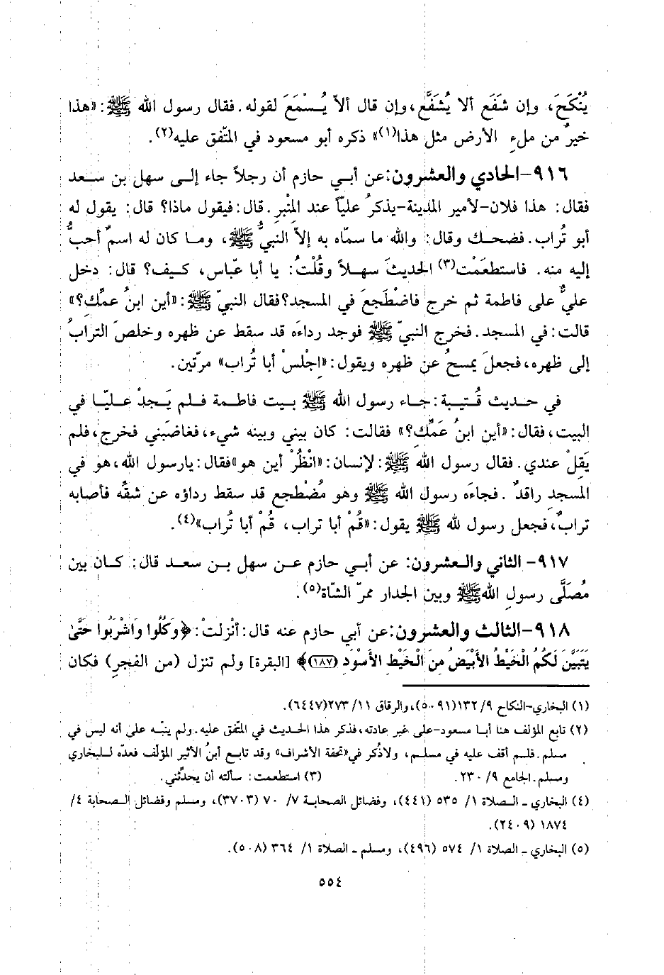 916 - الْحَادِي وَالْعشْرُونَ: عَن أبي حَازِم أَن رجلا جَاءَ إِلَى سهل بن سعد فَقَالَ: هَذَا فلَان - لأمير الْمَدِينَة - يذكر علياًّ عِنْد الْمِنْبَر. قَالَ: فَيَقُول مَاذَا؟ قَالَ: يَقُول لَهُ أَبُو تُرَاب. فَضَحِك وَقَالَ: وَالله مَا سَمَّاهُ بِهِ إِلَّا النَّبِي صلى الله عَلَيْهِ وَسلم، وَمَا كَانَ لَهُ اسمٌ أحب إِلَيْهِ مِنْهُ. فاستطعمت الحَدِيث سهلاً وَقلت: يَا أَبَا عَبَّاس، كَيفَ؟ قَالَ: دخل عليٌّ على فَاطِمَة ثمَّ خرج فاضطجع فِي الْمَسْجِد؟ فَقَالَ النَّبِي صلى الله عَلَيْهِ وَسلم: " أَيْن ابْن عمك؟ " قَالَت: فِي الْمَسْجِد. فَخرج النَّبِي صلى الله عَلَيْهِ وَسلم فَوجدَ رِدَاءَهُ قد سقط عَن ظَهره وخلص التُّرَاب إِلَى ظَهره، فَجعل يمسح عَن ظَهره وَيَقُول: " اجْلِسْ أَبَا تُرَاب " مرَّتَيْنِ.