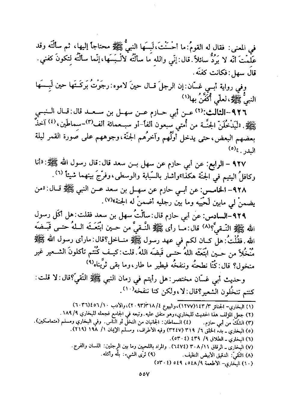 926 - الثَّالِث: عَن أبي حَازِم عَن سهل بن سعد قَالَ: قَالَ النَّبِي صلى الله عَلَيْهِ وَسلم. " ليدخلن الْجنَّة من أمتِي سَبْعُونَ ألفا - أَو سَبْعمِائة ألف - سماطين، آخذٌ بَعضهم الْبَعْض، حَتَّى يدْخل أَوَّلهمْ وَآخرهمْ الْجنَّة، وُجُوههم على صُورَة الْقَمَر لَيْلَة الْبَدْر. "