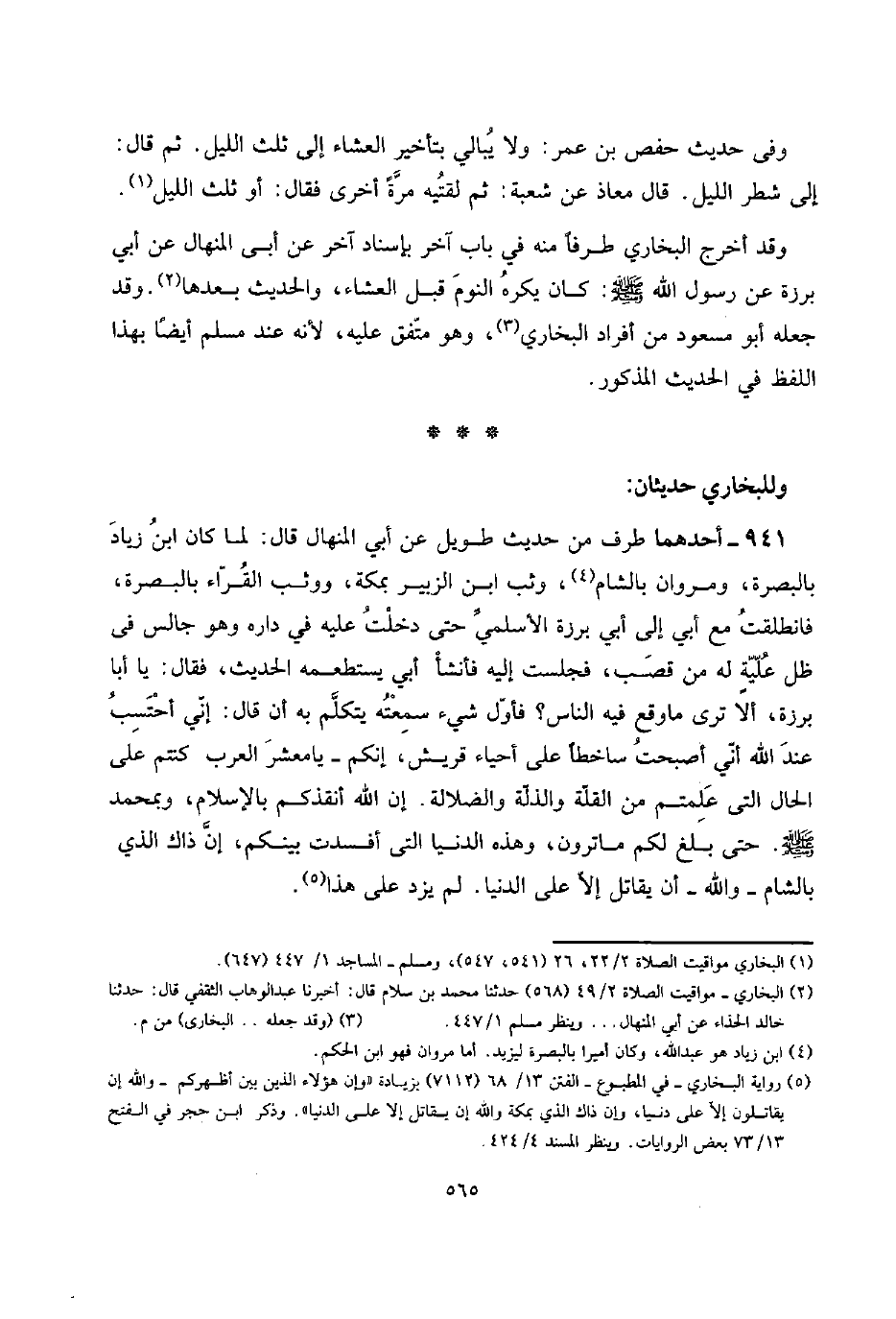 941 - أَحدهمَا طرف من حَدِيث طَوِيل عَن أبي الْمنْهَال قَالَ: لما كَانَ ابْن زِيَاد بِالْبَصْرَةِ، ومروان بِالشَّام، وثب ابْن الزبير بِمَكَّة، ووثب الْقُرَّاء بِالْبَصْرَةِ، فَانْطَلَقت مَعَ أبي إِلَى أبي بَرزَة الْأَسْلَمِيّ حَتَّى دخلت عَلَيْهِ فِي دَاره وَهُوَ جَالس فِي ظلّ علية لَهُ من قصب، فَجَلَست إِلَيْهِ فَأَنْشَأَ أبي يستطعمه الحَدِيث، فَقَالَ: يَا أَبَا بَرزَة، أَلا ترى مَا وَقع فِيهِ النَّاس؟ فَأول شَيْء سمعته يتَكَلَّم بِهِ أَن قَالَ: إِنِّي أحتسب عِنْد الله أَنِّي أَصبَحت ساخطاً على أَحيَاء قُرَيْش، إِنَّكُم - يَا معشر الْعَرَب كُنْتُم على الْحَال الَّتِي علمْتُم من الْقلَّة والذلة والضلالة. إِن الله أنقذكم بِالْإِسْلَامِ، وَبِمُحَمَّدٍ صلى الله عَلَيْهِ وَسلم. حَتَّى بلغ لكم مَا ترَوْنَ، وَهَذِه الدُّنْيَا الَّتِي أفسدت بَيْنكُم، إِن ذَاك الَّذِي بِالشَّام - وَالله - أَن يُقَاتل إِلَّا على الدُّنْيَا. لم يزدْ على هَذَا.