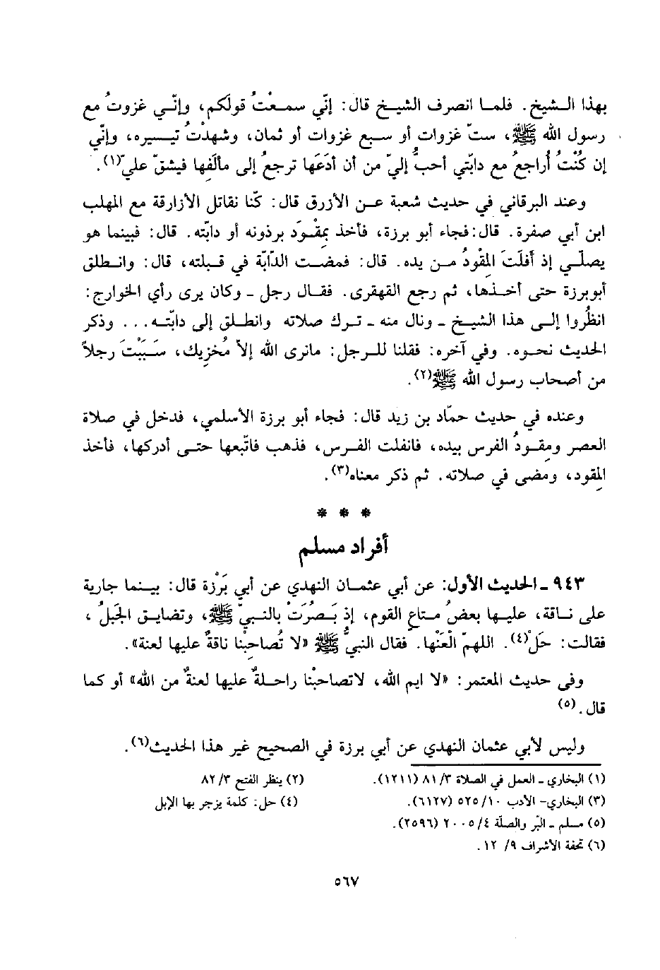 943 - الحَدِيث الأول: عَن أبي عُثْمَان النَّهْدِيّ عَن أبي بَرزَة قَالَ: بَيْنَمَا جَارِيَة على نَاقَة، عَلَيْهَا بعض متاعٍ الْقَوْم، إِذْ بصرت بِالنَّبِيِّ صلى الله عَلَيْهِ وَسلم، وتضايق الْجَبَل، فَقَالَت: حل. اللَّهُمَّ ألعنها. فَقَالَ النَّبِي صلى الله عَلَيْهِ وَسلم " لَا تصاحبنا ناقةٌ عَلَيْهَا لعنة ".