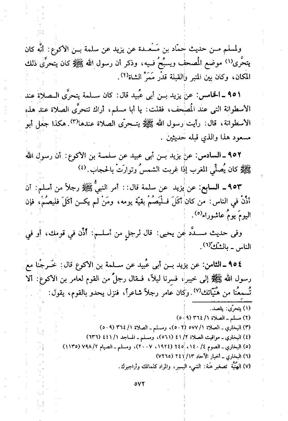 951 - الْخَامِس: عَن يزِيد بن أبي عبيد قَالَ: كَانَ سَلمَة يتحَرَّى الصَّلَاة عِنْد الأسطوانة الَّتِي عِنْد الْمُصحف، فَقلت: يَا أَبَا مُسلم، أَرَاك تتحرى الصَّلَاة عِنْد هَذِه الأسطوانة، قَالَ: رَأَيْت رَسُول الله صلى الله عَلَيْهِ وَسلم يتحَرَّى الصَّلَاة عِنْدهَا. هَكَذَا جعل أَبُو مَسْعُود هَذَا وَالَّذِي قبله حديثين.