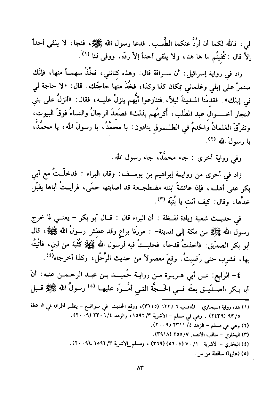 زَاد فِي رِوَايَة إِسْرَائِيل: أَن سراقَة قَالَ: وَهَذِه كِنَانَتِي، فَخذ سَهْما مِنْهَا، فَإنَّك ستمر على إبلي وغلماني بمَكَان كَذَا وَكَذَا، فَخذ مِنْهَا حَاجَتك. قَالَ: " لَا حَاجَة لي فِي إبلك ". فقدمنا الْمَدِينَة لَيْلًا، فتنازعوا أَيهمْ ينزل عَلَيْهِ، فَقَالَ: " أنزل على بني النجار أخوال عبد الْمطلب، أكْرمهم بذلك " فَصَعدَ الرِّجَال وَالنِّسَاء فَوق الْبيُوت، وتفرق الغلمان والخدم فِي الطّرق ينادون: يَا مُحَمَّد، يَا رَسُول الله، يَا مُحَمَّد، يَا رَسُول الله.