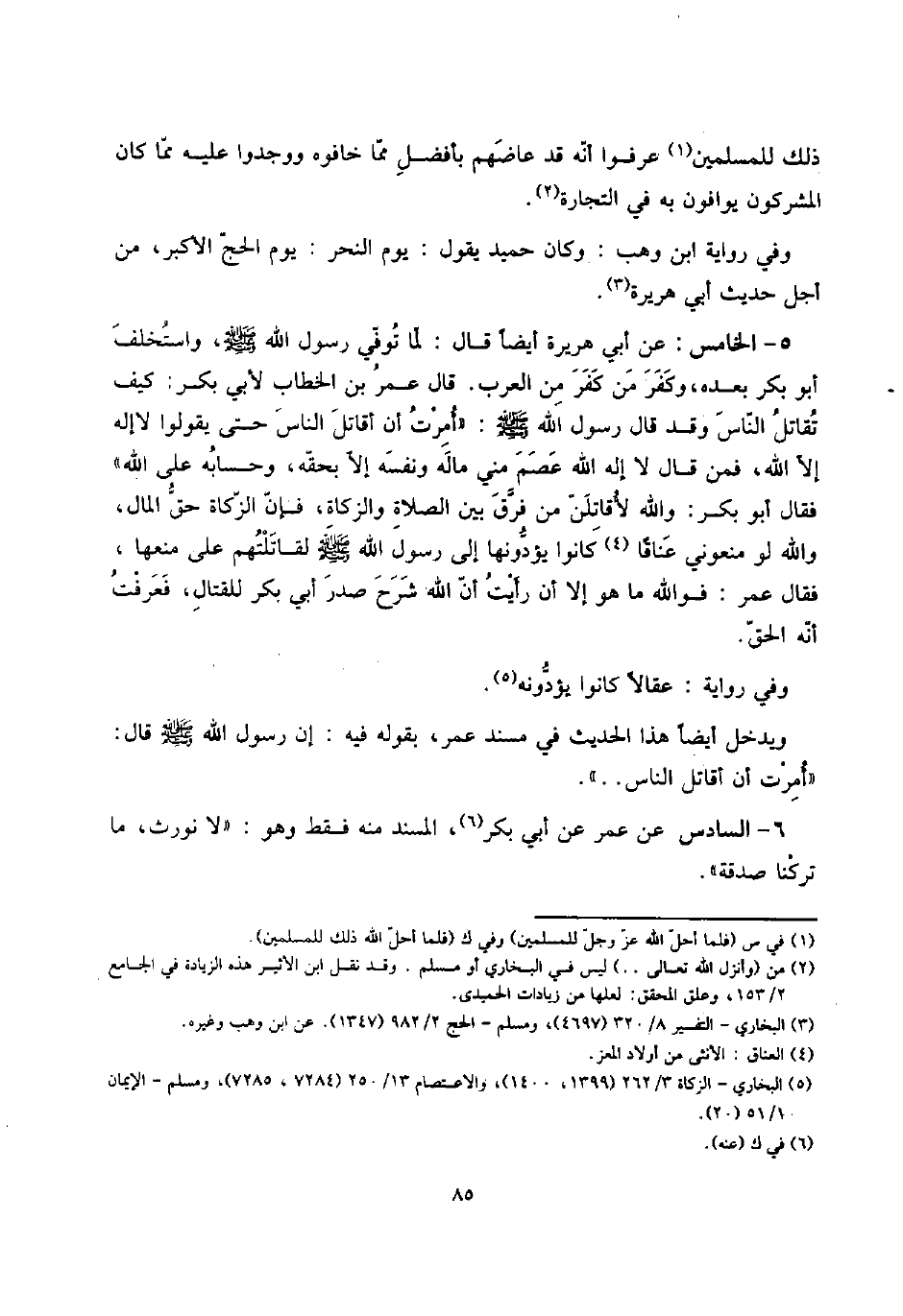 5 - الْخَامِس: عَن أبي هُرَيْرَة أَيْضا قَالَ: لما توفّي رَسُول الله صلى الله عَلَيْهِ وَسلم، واستخلف أَبُو بكر بعده، وَكفر من كفر من الْعَرَب. قَالَ عمر بن الْخطاب لأبي بكر: كَيفَ تقَاتل النَّاس وَقد قَالَ رَسُول الله صلى الله عَلَيْهِ وَسلم: " أمرت أَن أقَاتل النَّاس حَتَّى يَقُولُوا لَا إِلَه إِلَّا الله، فَمن قَالَ لَا إِلَه إِلَّا الله عصم مني مَاله وَنَفسه إِلَّا بِحقِّهِ، وحسابه على الله " فَقَالَ أَبُو بكر: وَالله لأقاتلن من فرق بَين الصَّلَاة وَالزَّكَاة، فَإِن الزَّكَاة حق المَال، وَالله لَو مَنَعُونِي عنَاقًا كَانُوا يؤدونها إِلَى رَسُول الله صلى الله عَلَيْهِ وَسلم لقاتلتهم على منعهَا، فَقَالَ عمر: فوَاللَّه مَا هُوَ إِلَّا أَن رَأَيْت أَن الله شرح صدر أبي بكر لِلْقِتَالِ، فَعرفت أَنه الْحق.