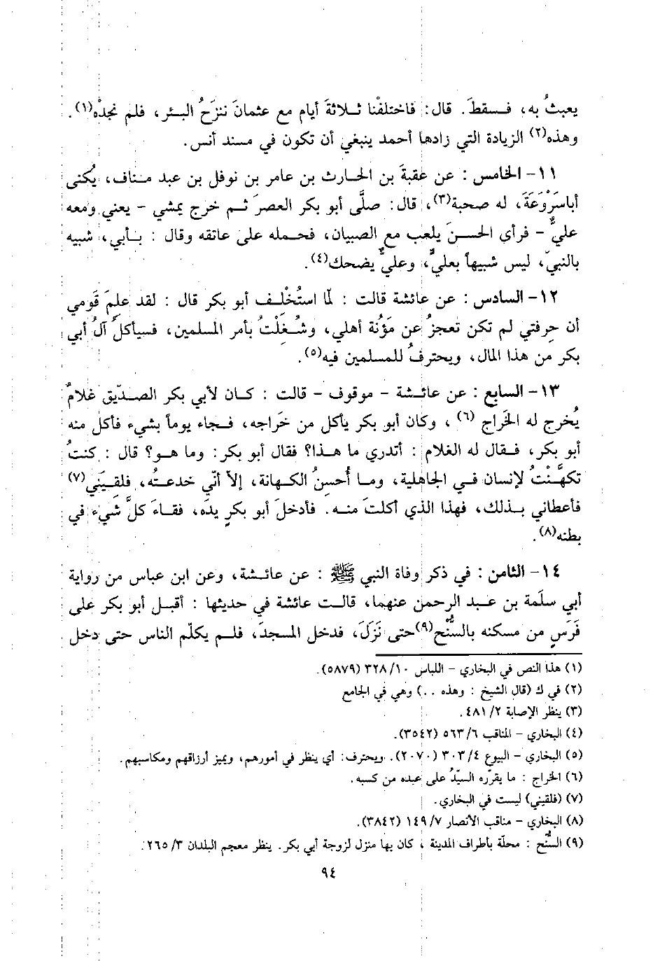 13 - السَّابِع: عَن عَائِشَة - مَوْقُوف - قَالَت: كَانَ لأبي بكر الصّديق غلامٌ يخرج لَهُ الْخراج، وَكَانَ أَبُو بكر يَأْكُل من خراجه، فجَاء يَوْمًا بِشَيْء فَأكل مِنْهُ أَبُو بكر، فَقَالَ لَهُ الْغُلَام: أَتَدْرِي مَا هَذَا؟ فَقَالَ أَبُو بكر: وَمَا هُوَ؟ قَالَ: كنت تكهنت لإِنْسَان فِي الْجَاهِلِيَّة، وَمَا أحسن الكهانة، إِلَّا أَنِّي خدعته، فلقيني فَأَعْطَانِي بذلك، فَهَذَا الَّذِي أكلت مِنْهُ. فَأدْخل أَبُو بكرٍ يَده، فقاء كل شَيْء فِي بَطْنه.