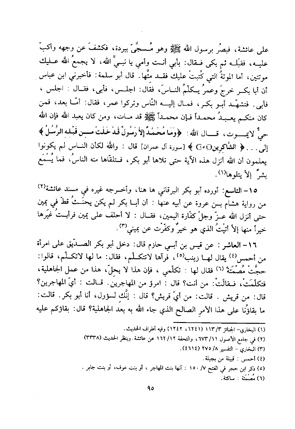 16 - الْعَاشِر: عَن قيس بن أبي حَازِم قَالَ: دخل أَبُو بكر الصّديق على امْرَأَة من أحمس يُقَال لَهَا زَيْنَب، فرآها لَا تَتَكَلَّم، فَقَالَ: مَا لَهَا لَا تكلم، قَالُوا: حجت مصمتةً فَقَالَ لَهَا: تكلمي، فَإِن هَذَا لَا يحل، هَذَا من عمل الْجَاهِلِيَّة، فتكلمت، فَقَالَت: من أَنْت؟ قَالَ: امْرُؤ من الْمُهَاجِرين. قَالَت: أَي الْمُهَاجِرين؟ قَالَ: من قُرَيْش. قَالَت: من أَي قُرَيْش؟ قَالَ: إِنَّك لسؤول، أَنا أَبُو بكر. قَالَت: مَا بقاؤنا على هَذَا الْأَمر الصَّالح الَّذِي جَاءَ الله بِهِ بعد الْجَاهِلِيَّة؟ قَالَ: بقاؤكم عَلَيْهِ
