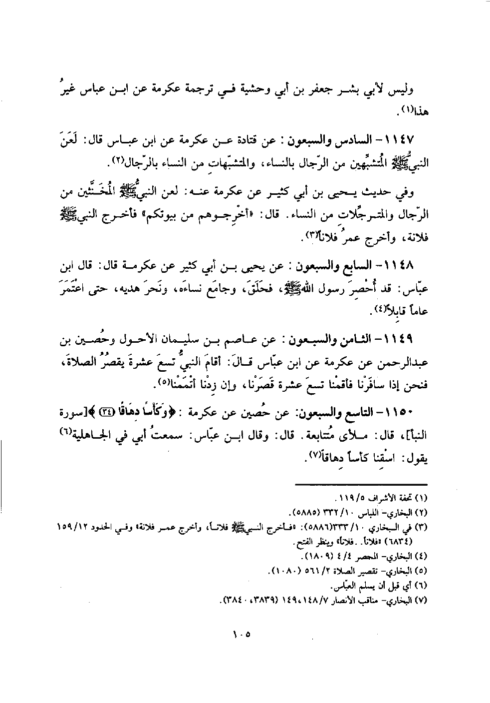 1147 - السَّادِس وَالسَّبْعُونَ: عَن قَتَادَة عَن عِكْرِمَة عَن ابْن عَبَّاس قَالَ: لعن النَّبِي صلى الله عَلَيْهِ وَسلم المتشبهين من الرِّجَال بِالنسَاء، والمتشبهات من النِّسَاء بِالرِّجَالِ.