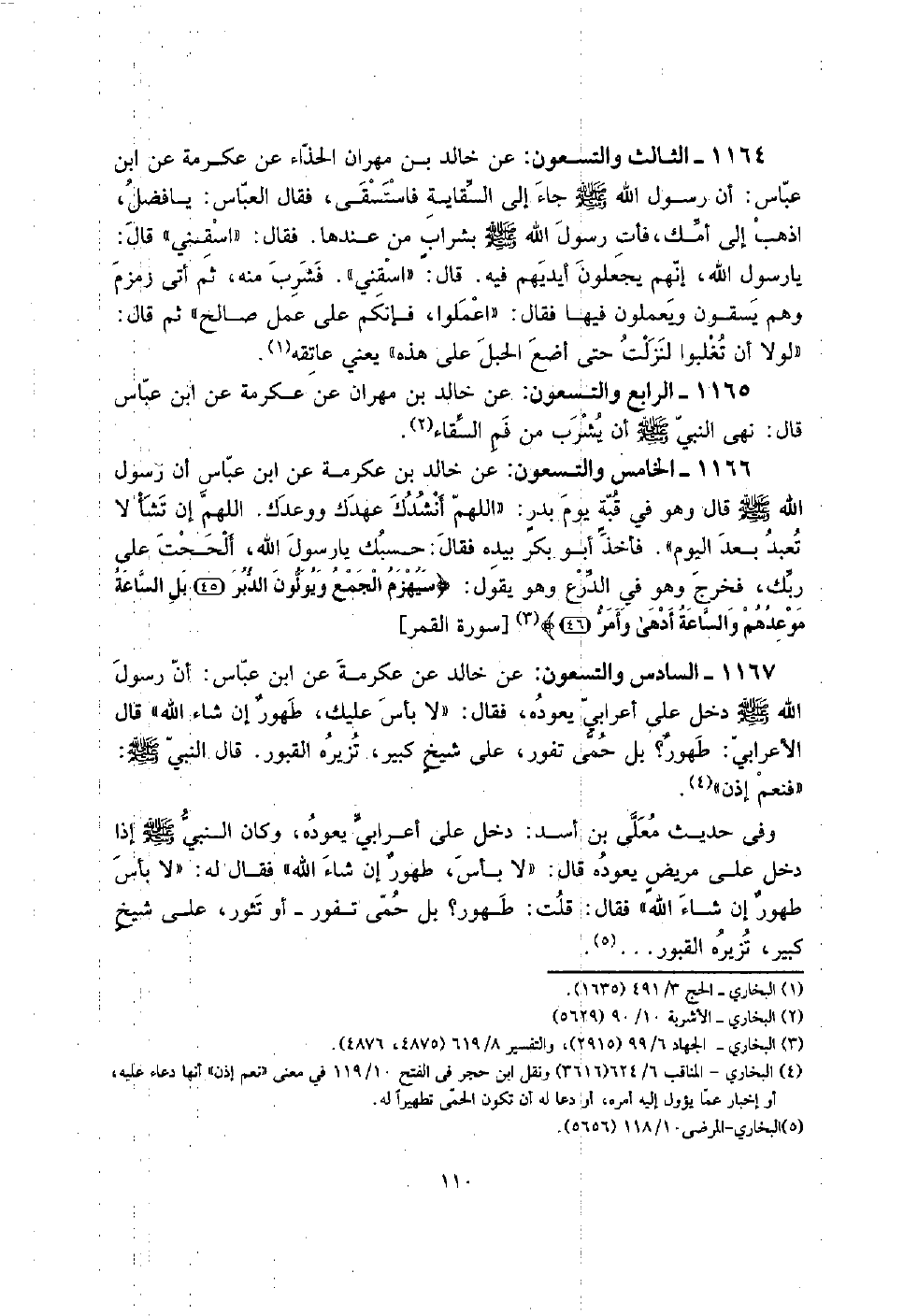 1167 - السَّادِس وَالتِّسْعُونَ: عَن خَالِد عَن عِكْرِمَة عَن ابْن عَبَّاس: أَن رَسُول الله صلى الله عَلَيْهِ وَسلم دخل على أَعْرَابِي يعودهُ، فَقَالَ: " لَا بَأْس عَلَيْك، طهورٌ إِن شَاءَ الله " قَالَ الْأَعرَابِي: طهورٌ؟ بل حمى تَفُور، على شيخٍ كَبِير، تزيره الْقُبُور. قَالَ النَّبِي صلى الله عَلَيْهِ وَسلم " فَنعم إِذن ".