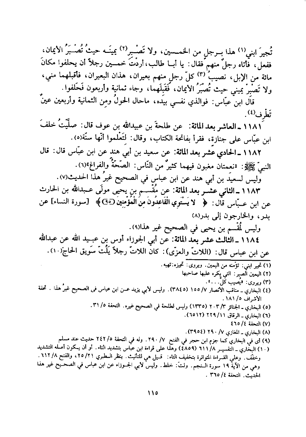 فوالذي نَفسِي بِيَدِهِ، مَا حَال الْحول وَمن الثَّمَانِية وَأَرْبَعين عينٌ تطرف. @ 1181 - الْعَاشِر بعد الْمِائَة: عَن طَلْحَة بن عبيد الله بن عَوْف قَالَ: صليت خلف ابْن عَبَّاس على جنازةٍ، فَقَرَأَ بِفَاتِحَة الْكتاب، وَقَالَ: لِتَعْلَمُوا أَنَّهَا سنة.