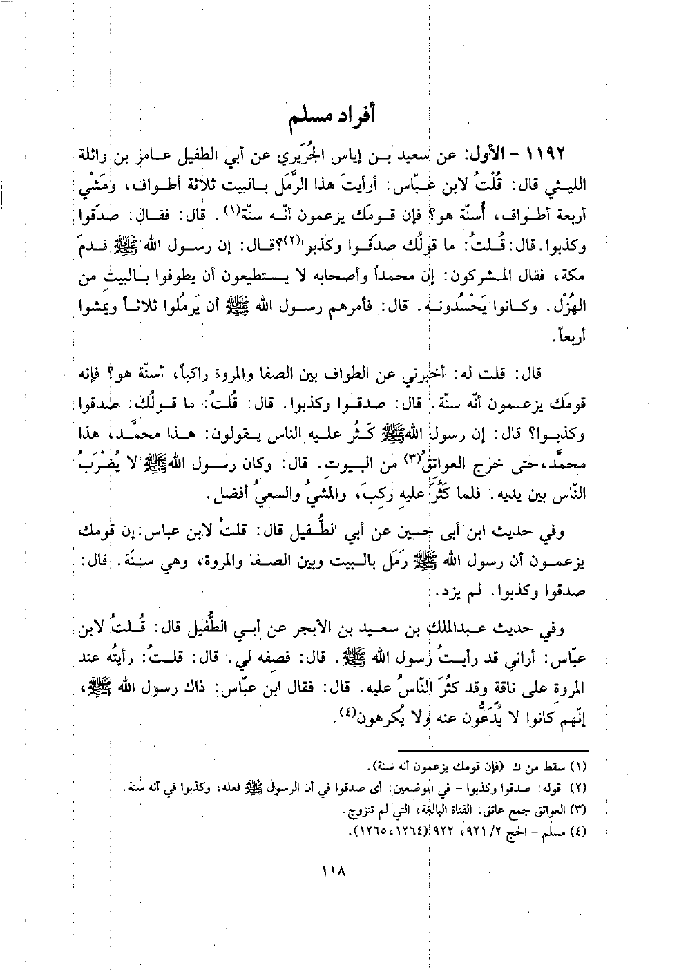 1192 - الأول: عَن سعيد بن إِيَاس الْجريرِي عَن أبي الطُّفَيْل عَامر بن وَاثِلَة اللَّيْثِيّ قَالَ: قلت لِابْنِ عَبَّاس: أَرَأَيْت هَذَا الرمل بِالْبَيْتِ ثَلَاثَة أطواف، ومشي أَرْبَعَة أطواف، أسنة هُوَ؟ فَإِن قَوْمك يَزْعمُونَ أَنه سنة. قَالَ: فَقَالَ: صدقُوا وكذبوا. قَالَ: قلت: مَا قَوْلك صدقُوا وكذبوا " قَالَ: إِن رَسُول الله صلى الله عَلَيْهِ وَسلم قدم مَكَّة، فَقَالَ الْمُشْركُونَ: إِن مُحَمَّدًا وَأَصْحَابه لَا يَسْتَطِيعُونَ أَن يطوفوا بِالْبَيْتِ من الْهزْل. وَكَانُوا يحسدونه. قَالَ: فَأَمرهمْ رَسُول الله صلى الله عَلَيْهِ وَسلم أَن يرملوا ثَلَاثًا ويمشوا أَرْبعا.