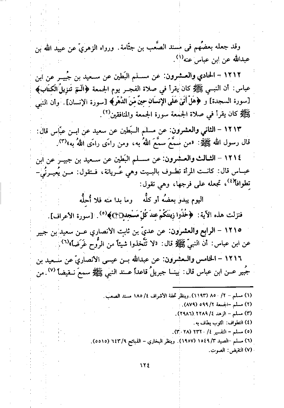 1212 - الْحَادِي وَالْعشْرُونَ: عَن مُسلم البطين عَن سعيد بن جُبَير عَن ابْن عَبَّاس: أَن النَّبِي صلى الله عَلَيْهِ وَسلم كَانَ يقْرَأ فِي صَلَاة الْفجْر يَوْم الْجُمُعَة {الم تَنْزِيل الْكتاب} [سُورَة السَّجْدَة] و {هَل أَتَى على الْإِنْسَان حِين من الدَّهْر} [سُورَة الْإِنْسَان] . وَأَن النَّبِي صلى الله عَلَيْهِ وَسلم كَانَ يقْرَأ فِي صَلَاة الْجُمُعَة سُورَة الْجُمُعَة وَالْمُنَافِقِينَ.