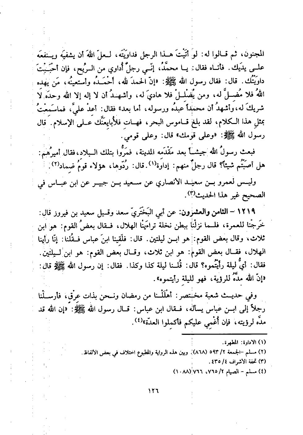 1219 - الثَّامِن وَالْعشْرُونَ: عَن أبي البخْترِي سعد وَقيل سعيد بن فَيْرُوز قَالَ: خرجنَا للْعُمْرَة، فَلَمَّا نزلنَا بِبَطن نَخْلَة تراءينا الْهلَال، فَقَالَ بعض الْقَوْم: هُوَ ابْن ثَلَاث، وَقَالَ بعض الْقَوْم: هُوَ ابْن لَيْلَتَيْنِ. قَالَ: فلقينا ابْن عَبَّاس فَقُلْنَا: إِنَّا رَأينَا الْهلَال، فَقَالَ بعض الْقَوْم: هُوَ ابْن ثَلَاث، وَقَالَ بعض الْقَوْم: هُوَ ابْن لَيْلَتَيْنِ.
