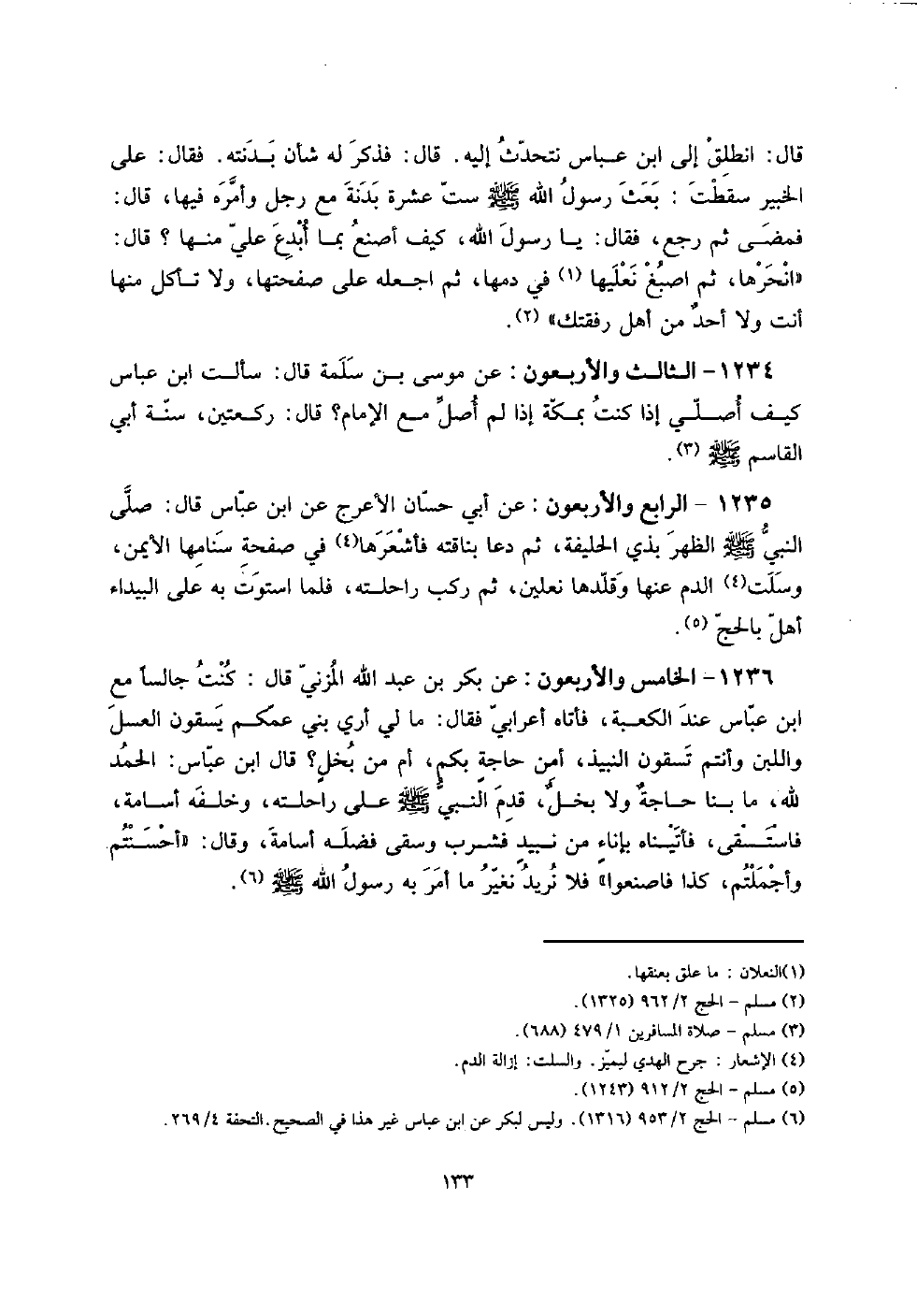 1235 - الرَّابِع وَالْأَرْبَعُونَ: عَن أبي حسان الْأَعْرَج عَن ابْن عَبَّاس قَالَ: صلى النَّبِي صلى الله عَلَيْهِ وَسلم الظّهْر بِذِي الحليفة، ثمَّ دَعَا بناقته فأشعرها فِي صفحة سنامها الْأَيْمن، وسلت الدَّم عَنْهَا وقلدها نَعْلَيْنِ، ثمَّ ركب رَاحِلَته، فَلَمَّا اسْتَوَت بِهِ على الْبَيْدَاء أهل بِالْحَجِّ.