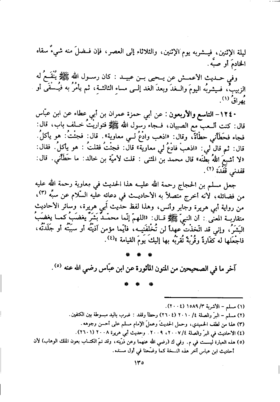 1240 - التَّاسِع وَالْأَرْبَعُونَ: عَن أبي حَمْزَة عمرَان بن أبي عَطاء عَن ابْن عَبَّاس قَالَ: كنت أَلعَب مَعَ الصّبيان، فجَاء رَسُول الله صلى الله عَلَيْهِ وَسلم فتواريت خلف بَاب، قَالَ: فجَاء فحطأني حطأةً، وَقَالَ: " اذْهَبْ وادع لي مُعَاوِيَة ". قَالَ: فَجئْت: هُوَ يَأْكُل. قَالَ: ثمَّ قَالَ لي: " اذْهَبْ فَادع لي مُعَاوِيَة " قَالَ: فَجئْت فَقلت: هُوَ يَأْكُل. فَقَالَ: " لَا أشْبع الله بَطْنه " قَالَ مُحَمَّد بن الْمثنى: قلت لأمية بن خَالِد: مَا حطأني. قَالَ: قفدني قفدة.
