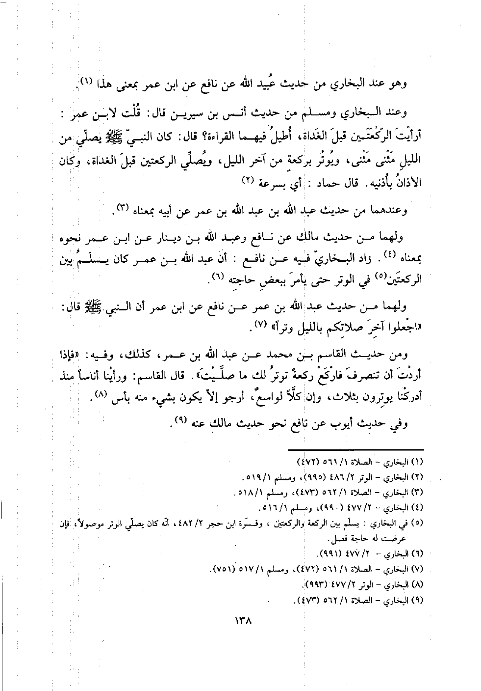 وَلَهُمَا من حَدِيث مَالك عَن نَافِع وَعبد الله بن دِينَار عَن ابْن عمر نَحوه بِمَعْنَاهُ. زَاد البُخَارِيّ فِيهِ عَن نَافِع: أَن عبد الله بن عمر كَانَ يسلم بَين الرَّكْعَتَيْنِ فِي الْوتر حَتَّى يَأْمر بِبَعْض حَاجته.