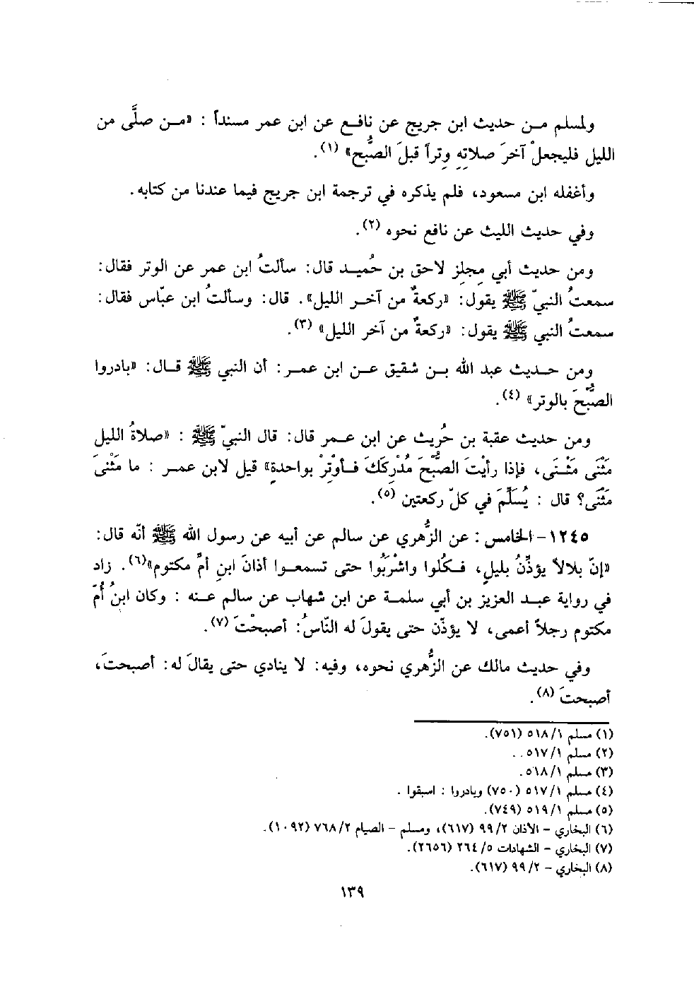 1245 - الْخَامِس: عَن الزُّهْرِيّ عَن سَالم عَن أَبِيه عَن رَسُول صلى الله عَلَيْهِ وَسلم أَنه قَالَ: " إِن بِلَالًا يُؤذن بليلٍ، فَكُلُوا وَاشْرَبُوا حَتَّى تسمعوا أَذَان ابْن أم مَكْتُوم ". زَاد فِي رِوَايَة عبد الْعَزِيز بن أبي سَلمَة عَن ابْن شهَاب عَن سَالم عَنهُ: وَكَانَ ابْن أم مَكْتُوم رجلا أعمى، لَا يُؤذن حَتَّى يَقُول لَهُ النَّاس: أَصبَحت.
