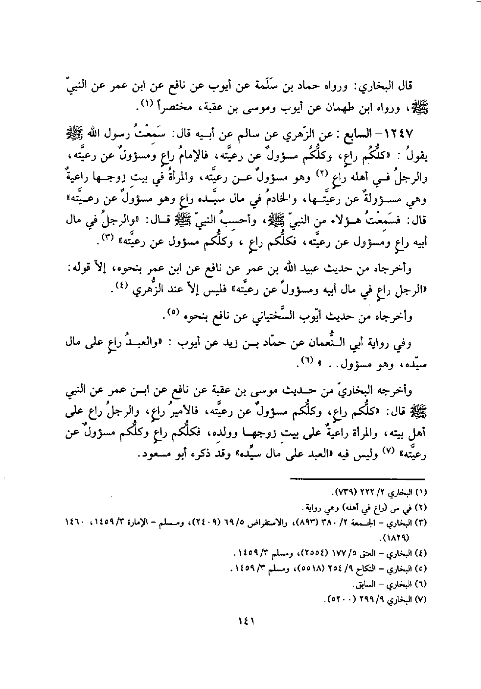 1247 - السَّابِع: عَن الزُّهْرِيّ عَن سَالم عَن أَبِيه قَالَ: سَمِعت رَسُول الله صلى الله عَلَيْهِ وَسلم يَقُول: " كلكُمْ راعٍ، وكلكم مسؤولٌ عَن رَعيته، فالإمام راعٍ ومسؤولٌ عَن رَعيته، وَالرجل فِي أَهله راعٍ وَهُوَ مسؤولٌ عَن رَعيته، وَالْمَرْأَة فِي بَيت زَوجهَا راعيةٌ وَهِي مسؤولةٌ عَن رعيتها، وَالْخَادِم فِي مَال سَيّده راعٍ وَهُوَ مسؤولٌ عَن رَعيته " قَالَ: فَسمِعت هَؤُلَاءِ من النَّبِي صلى الله عَلَيْهِ وَسلم، وأحسب النَّبِي صلى الله عَلَيْهِ وَسلم قَالَ: " وَالرجل فِي مَال أَبِيه راعٍ ومسؤول عَن رَعيته، فكلكم راعٍ، وكلكم مسؤول عَن رَعيته ".