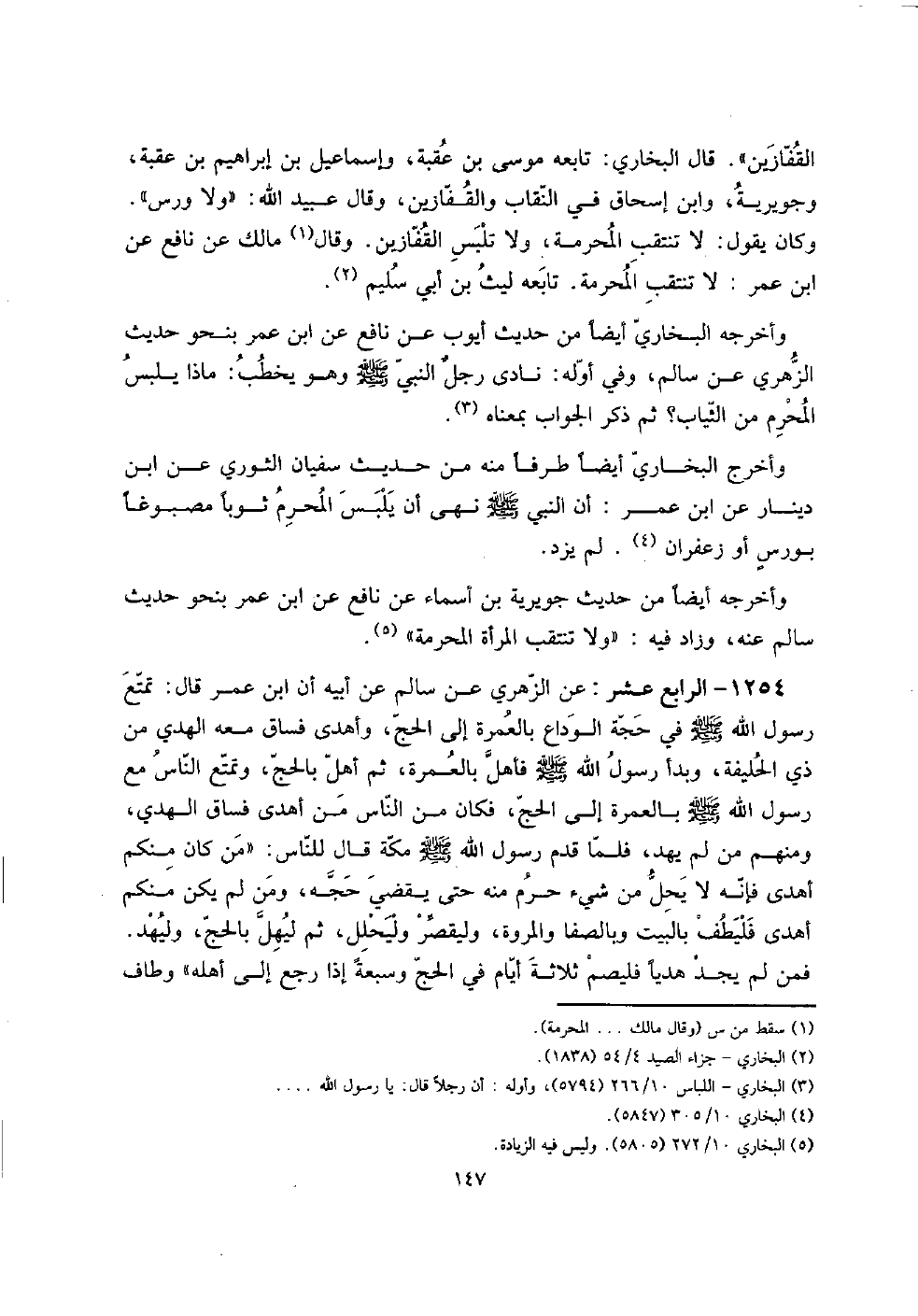 نابعه مُوسَى بن عقبَة، وَإِسْمَاعِيل بن إِبْرَاهِيم بن عقبَة، وَجُوَيْرِية، وَابْن إِسْحَاق فِي النقاب والقفازين، وَقَالَ عبيد الله: " وَلَا ورس ".