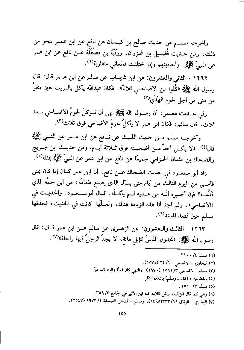 1262 - الثَّانِي وَالْعشْرُونَ: عَن ابْن شهَاب عَن سَالم عَن ابْن عمر قَالَ: قَالَ رَسُول الله صلى الله عَلَيْهِ وَسلم " كلوا من الْأَضَاحِي ثَلَاثًا ". فَكَانَ عبد الله يَأْكُل بالزيت حِين ينفر من منى من أجل لُحُوم الْهَدْي.