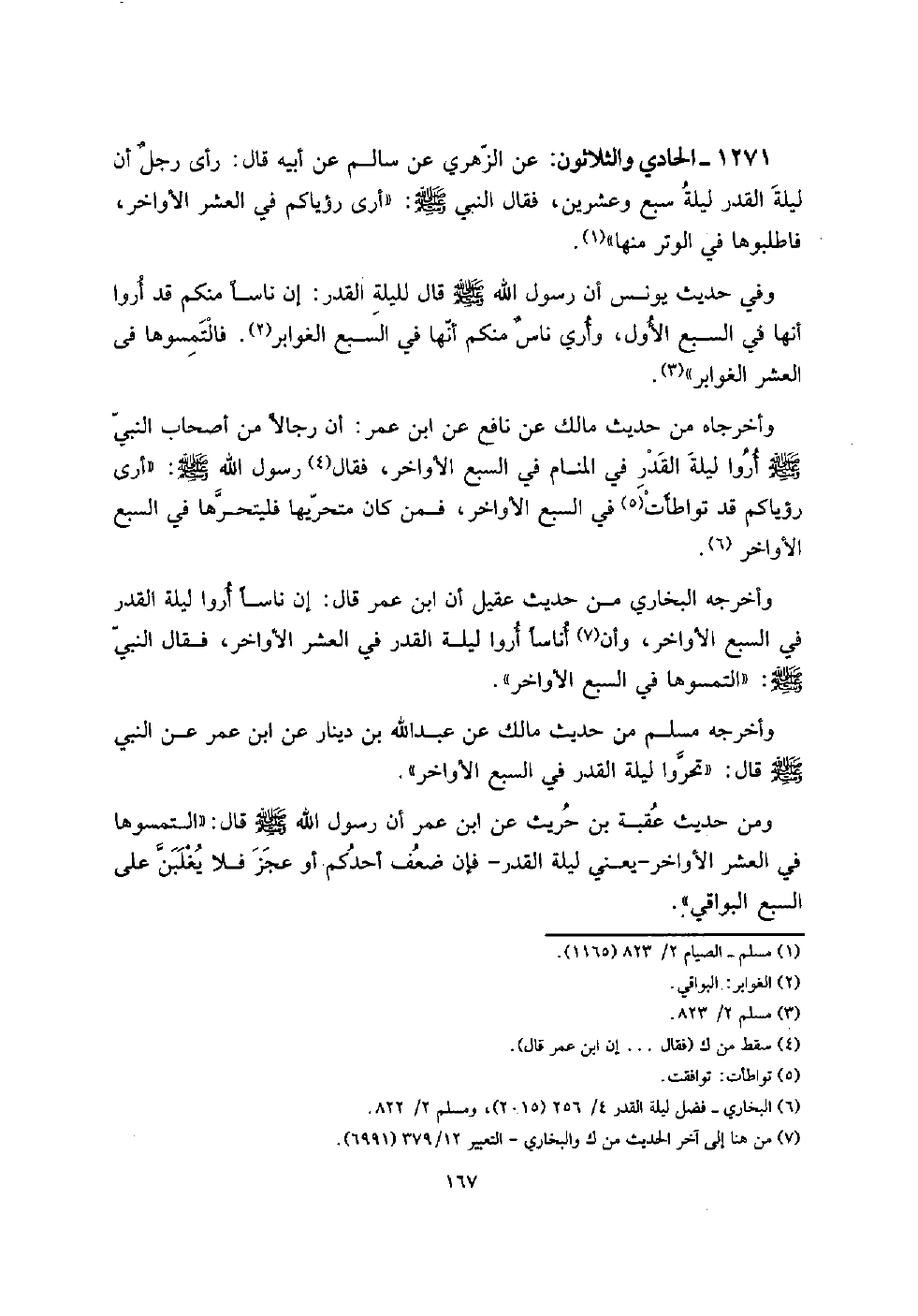إِن نَاسا مِنْكُم قد أروا أَنَّهَا فِي السَّبع الأول، وأري ناسٌ مِنْكُم أَنَّهَا فِي السَّبع الغوابر. فالتمسوها فِي الْعشْر الغوابر ".