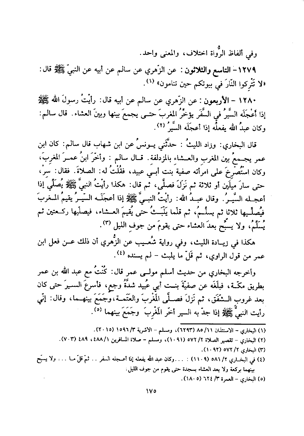 1280 - الْأَرْبَعُونَ: عَن الزُّهْرِيّ عَن سَالم عَن أَبِيه قَالَ: رَأَيْت رَسُول الله صلى الله عَلَيْهِ وَسلم إِذا أعجله السّير فِي السّفر يُؤَخر الْمغرب حَتَّى يجمع بَينهَا وَبَين الْعشَاء. قَالَ سَالم: وَكَانَ عبد الله يَفْعَله إِذا أعجله السّير.