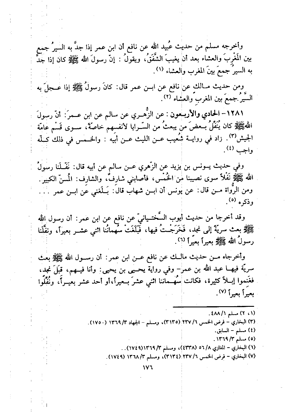 1281 - الْحَادِي وَالْأَرْبَعُونَ: عَن الزُّهْرِيّ عَن سَالم عَن ابْن عمر: أَن رَسُول الله صلى الله عَلَيْهِ وَسلم كَانَ ينفل بعض من يبْعَث من السَّرَايَا لأَنْفُسِهِمْ خَاصَّة، سوى قسم عَامَّة الْجَيْش. زَاد فِي رِوَايَة شُعَيْب عَن اللَّيْث عَن أَبِيه: وَالْخمس فِي ذَلِك كُله وَاجِب.