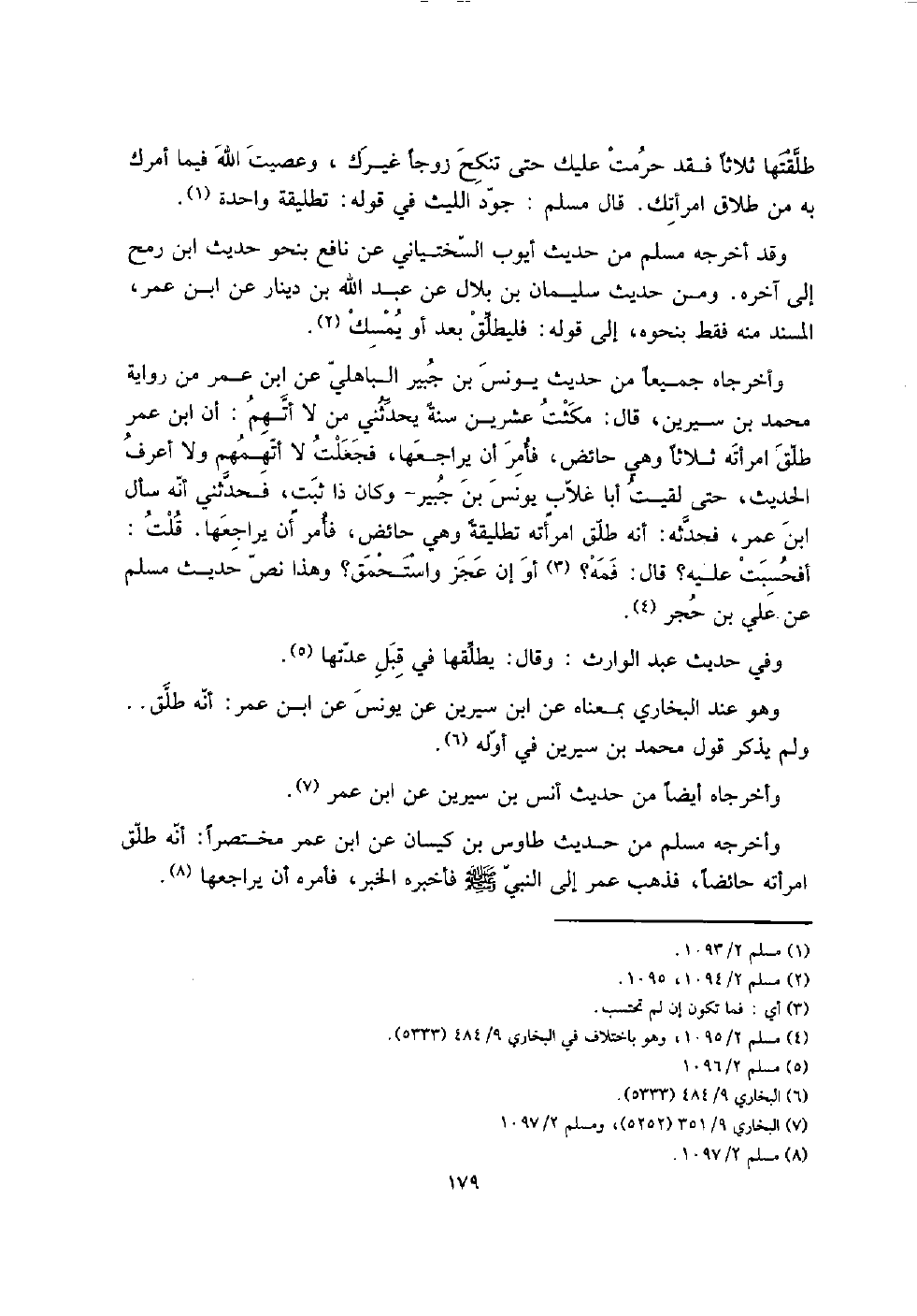 أَن ابْن عمر طلق امْرَأَته ثَلَاثًا وَهِي حَائِض، فَأمر أَن يُرَاجِعهَا، فَجعلت لَا أتهمهم وَلَا أعرف الحَدِيث، حَتَّى لقِيت أَبَا غلاب يُونُس بن جُبَير - وَكَانَ ذَا ثَبت، فَحَدثني أَنه سَأَلَ ابْن عمر، فحدثه: أَنه طلق امْرَأَته تَطْلِيقَة وَهِي حَائِض، فَأمر أَن يُرَاجِعهَا. قلت: أفحسبت عَلَيْهِ؟ قَالَ: فَمه؟ أَو إِن عجز واستحمق؟ وَهَذَا نَص حَدِيث مُسلم عَن عَليّ بن حجر.