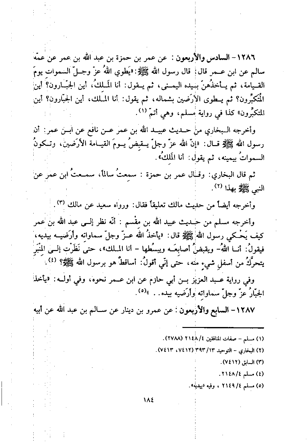 1286 - وَالسَّادِس وَالْأَرْبَعُونَ: عَن عمر بن حَمْزَة بن عبد الله بن عمر عَن عَمه سَالم عَن ابْن عمر قَالَ: قَالَ رَسُول الله صلى الله عَلَيْهِ وَسلم: " يطوي الله عز وَجل السَّمَوَات يَوْم الْقِيَامَة، ثمَّ يأخذهن بِيَدِهِ الْيُمْنَى، ثمَّ يَقُول: أَنا الْملك، أَيْن الجبارون؟ أَيْن المتكبرون؟ " ثمَّ يطوي الْأَرْضين بِشمَالِهِ، ثمَّ يَقُول: أَنا الْملك، أَيْن الجبارون؟ أَيْن المتكبرون " كَذَا فِي رِوَايَة مُسلم، وَهِي أتم.