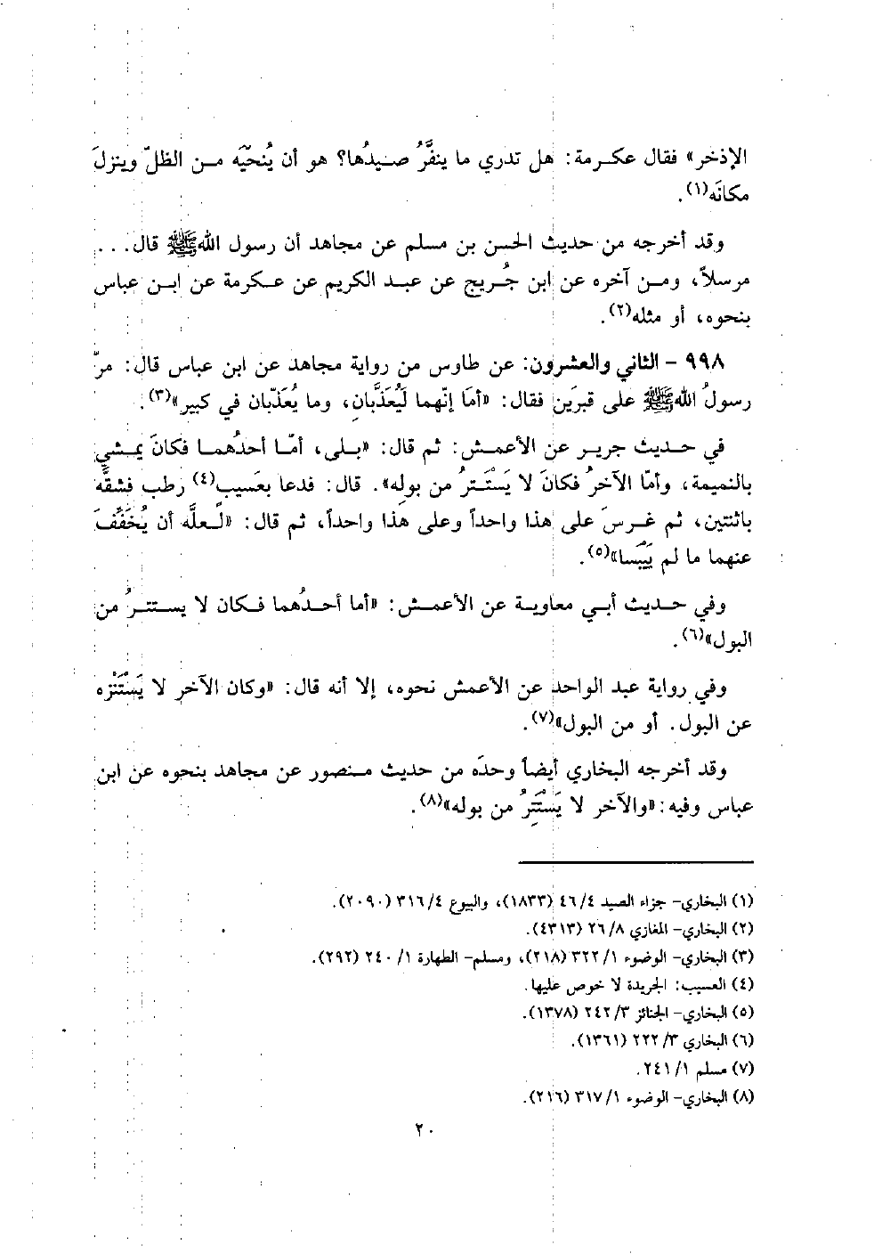 998 - الثَّانِي وَالْعشْرُونَ: عَن طَاوس من رِوَايَة مُجَاهِد عَن ابْن عَبَّاس قَالَ: مر رَسُول الله صلى الله عَلَيْهِ وَسلم على قبرين فَقَالَ: " أما إنَّهُمَا ليعذبان، وَمَا يعذبان فِي كَبِير ".