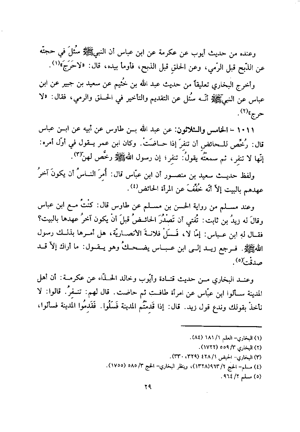 1011 - الْخَامِس وَالثَّلَاثُونَ: عَن عبد الله بن طَاوس عَن أَبِيه عَن ابْن عَبَّاس قَالَ: رخص للحائض أَن تنفر إِذا حَاضَت. وَكَانَ ابْن عمر يَقُول فِي أول أمره: إِنَّهَا لَا تنفر، ثمَّ سمعته يَقُول: تنفر؛ إِن رَسُول الله صلى الله عَلَيْهِ وَسلم رخص لَهُنَّ.