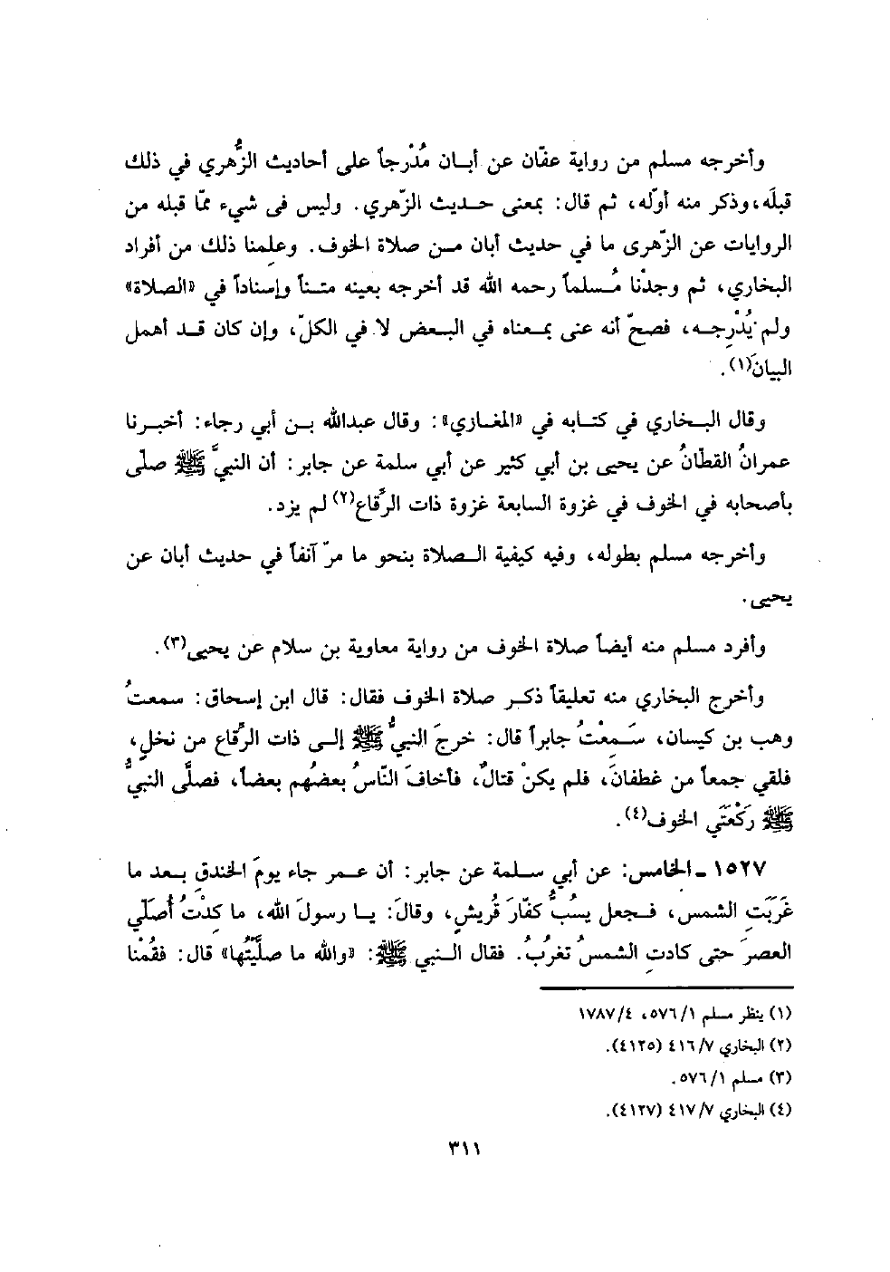 وَأخرجه مُسلم من رِوَايَة عَفَّان عَن أبان مدرجاً على أَحَادِيث الزُّهْرِيّ فِي ذَلِك قبله، وَذكر مِنْهُ أَوله، ثمَّ قَالَ: بِمَعْنى حَدِيث الزُّهْرِيّ. وَلَيْسَ فِي شَيْء مِمَّا قبله من الرِّوَايَات عَن الزُّهْرِيّ مَا فِي حَدِيث أبان من صَلَاة الْخَوْف. وَعلمنَا ذَلِك من أَفْرَاد البُخَارِيّ، ثمَّ وجدنَا مُسلما رَحمَه الله قد أخرجه بِعَيْنِه متْنا وإسناداً فِي " الصَّلَاة " وَلم يدرجه، فصح أَنه عَنى بِمَعْنَاهُ فِي الْبَعْض لَا فِي الْكل، وَإِن كَانَ قد أهمل الْبَيَان.