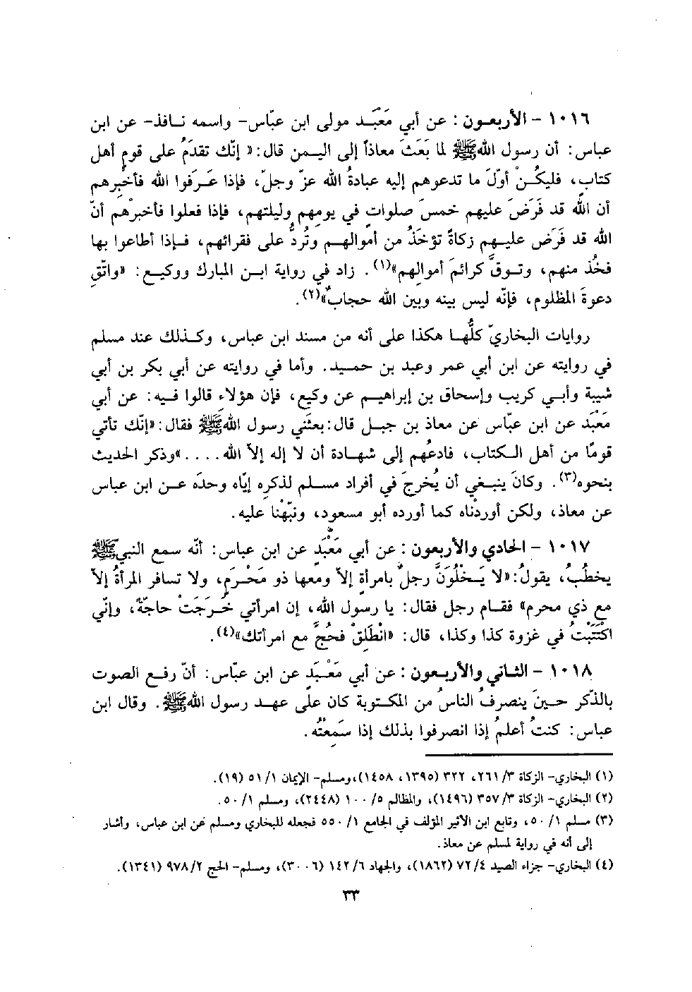 1016 - الْأَرْبَعُونَ: عَن أبي معبد مولى ابْن عَبَّاس - واسْمه نَافِذ - عَن ابْن عَبَّاس: أَن رَسُول الله صلى الله عَلَيْهِ وَسلم لما بعث معَاذًا إِلَى الْيمن قَالَ: " إِنَّك تقدم على قومٍ أهل كتاب، فَلْيَكُن أول مَا تدعوهم إِلَيْهِ عبَادَة الله عز وَجل، فَإِذا عرفُوا الله فَأخْبرهُم أَن الله قد فرض عَلَيْهِم خمس صلواتٍ فِي يومهم وليلتهم، فَإِذا فعلوا فَأخْبرهُم أَن الله قد فرض عَلَيْهِم زَكَاة تُؤْخَذ من أَمْوَالهم وَترد على فقرائهم، فَإِذا أطاعوا بهَا فَخذ مِنْهُم، وتوق كرائم أَمْوَالهم ". زَاد فِي رِوَايَة ابْن الْمُبَارك ووكيع: " وَاتَّقِ دَعْوَة الْمَظْلُوم، فَإِنَّهُ لَيْسَ بَينه وَبَين الله حجابٌ ".