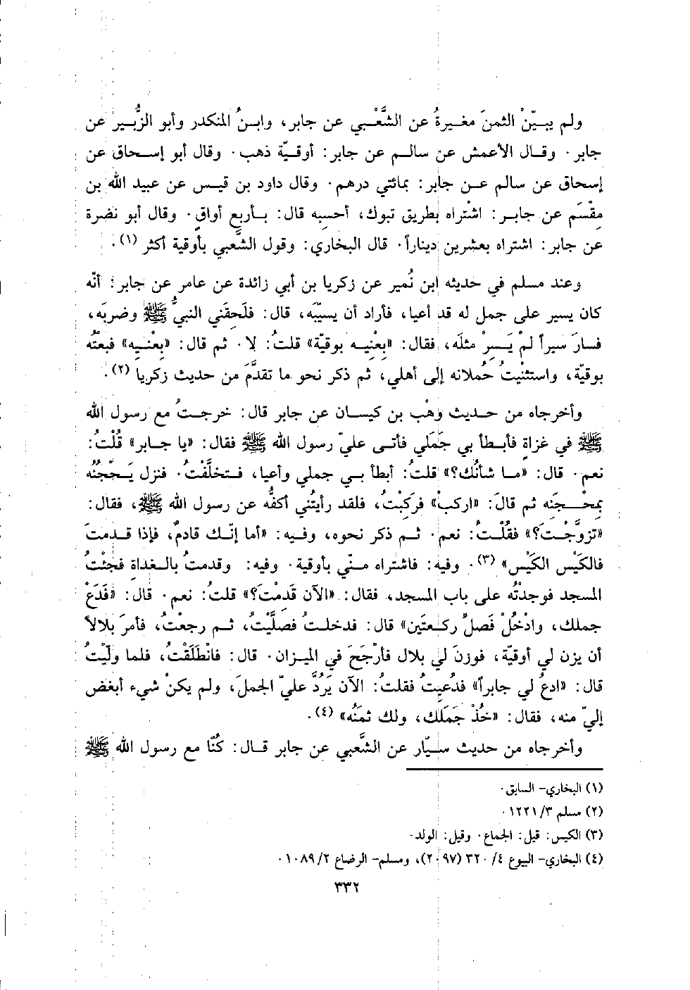 وَلم يبين الثّمن مُغيرَة عَن الشّعبِيّ عَن جَابر، وَابْن الْمُنْكَدر وَأَبُو الزبير عَن جَابر. وَقَالَ الْأَعْمَش عَن سَالم عَن جَابر: أُوقِيَّة ذهب. وَقَالَ أَبُو إِسْحَاق عَن إِسْحَاق عَن سَالم عَن جَابر: بِمِائَتي دِرْهَم. وَقَالَ دَاوُد بن قيس عَن عبيد الله بن مقسم عَن جَابر: اشْتَرَاهُ بطرِيق تَبُوك، أَحْسبهُ قَالَ: بِأَرْبَع أواقٍ. وَقَالَ أَبُو نَضرة عَن جَابر: اشْتَرَاهُ بِعشْرين دِينَارا. قَالَ البُخَارِيّ: وَقَول الشّعبِيّ بأوقية أَكثر.