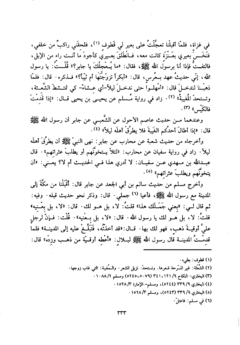 فِي غزاةٍ، فَلَمَّا أَقبلنَا تعجلت على بعير لي قطوفٍ، فلحقني راكبٌ من خَلْفي، فَنَخَسَ بَعِيري بعنزةٍ كَانَت مَعَه، فَانْطَلق بَعِيري كأجود مَا أَنْت راءٍ من الْإِبِل، فَالْتَفت فَإِذا أَنا برَسُول الله صلى الله عَلَيْهِ وَسلم، فَقَالَ: " مَا يعجلك يَا جَابر؟ " قلت: يَا رَسُول الله، إِنِّي حَدِيث عهد بعرسٍ، قَالَ: " أبكراً تَزَوَّجتهَا أم ثَيِّبًا؟ " فَذكره. قَالَ: فَلَمَّا ذَهَبْنَا لنَدْخُل قَالَ: " أمهلوا حَتَّى ندخل لَيْلًا - أَي عشَاء - كي تمتشط الشعثة، وتستحد المغيبة ". زَاد فِي رِوَايَة مُسلم عَن يحيى بن يحيى قَالَ: " إِذا قدمت فالكيس ".