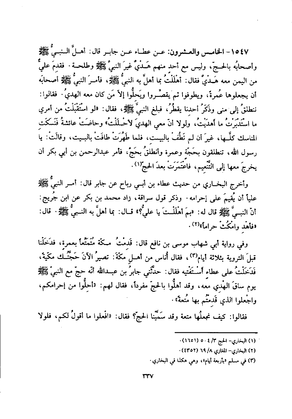 1547 - الْخَامِس وَالْعشْرُونَ: عَن عَطاء عَن جَابر قَالَ: أهل النَّبِي صلى الله عَلَيْهِ وَسلم وَأَصْحَابه بِالْحَجِّ، وَلَيْسَ مَعَ أحدٍ مِنْهُم هديٌ غير النَّبِي صلى الله عَلَيْهِ وَسلم وَطَلْحَة. فَقدم عليٌّ من الْيمن مَعَه هديٌ فَقَالَ: أَهلَلْت بِمَا أهل بِهِ النَّبِي صلى الله عَلَيْهِ وَسلم، فَأمر النَّبِي صلى الله عَلَيْهِ وَسلم أَصْحَابه أَن يجعلوها عمْرَة، ويطوفوا ثمَّ يقصروا ويحلوا إِلَّا من كَانَ مَعَه الْهَدْي. فَقَالُوا: ننطلق إِلَى منى وَذكر أَحَدنَا يقطر، فَبلغ النَّبِي صلى الله عَلَيْهِ وَسلم، فَقَالَ: " لَو اسْتقْبلت من أَمْرِي مَا اسْتَدْبَرت مَا أهديت، وَلَوْلَا أَن معي الْهَدْي لأحللت " وحاضت عَائِشَة فنسكت الْمَنَاسِك كلهَا، غير أَن لم تطف بِالْبَيْتِ، فَلَمَّا طهرت طافت بِالْبَيْتِ، وَقَالَت: يَا رَسُول الله، تنطلقون بحجةٍ وَعمرَة وأنطلق بحجٍّ، فَأمر عبد الرَّحْمَن بن أبي بكر أَن يخرج مَعهَا إِلَى التَّنْعِيم، فاعتمرت بعد الْحَج.