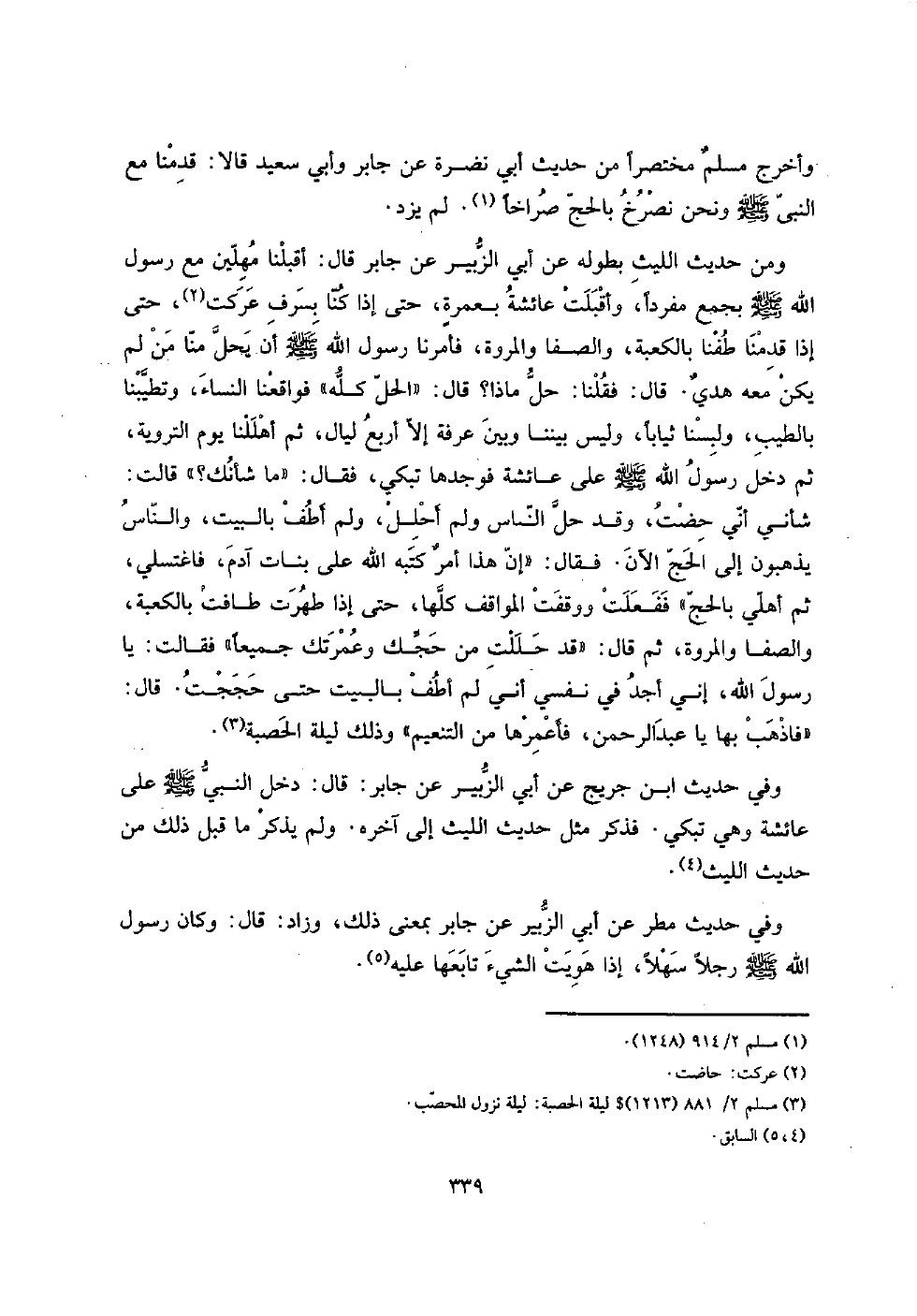 أَقبلنَا مهلين مَعَ رَسُول الله صلى الله عَلَيْهِ وَسلم بِجمع مُفردا، وَأَقْبَلت عَائِشَة بعمرةٍ، حَتَّى إِذا كُنَّا بسرف عركت، حَتَّى إِذا قدمنَا طفنا بِالْكَعْبَةِ، والصفا والمروة، فَأمرنَا رَسُول الله صلى الله عَلَيْهِ وَسلم أَن يحل منا من لم يكن مَعَه هديٌ. قَالَ: فَقُلْنَا: حل مَاذَا؟ قَالَ: " الْحل كُله " فواقعنا النِّسَاء، وتطيبنا بالطيب، ولبسنا ثيابًا، وَلَيْسَ بَيْننَا وَبَين عَرَفَة إِلَّا أَربع لَيَال، ثمَّ أَهْلَلْنَا يَوْم التَّرويَة، ثمَّ دخل رَسُول الله صلى الله عَلَيْهِ وَسلم على عَائِشَة فَوَجَدَهَا تبْكي، فَقَالَ: " مَا شَأْنك؟ " قَالَت: شأني أَنِّي حِضْت، وَقد حل النَّاس وَلم أحلل، وَلم أطف بِالْبَيْتِ، وَالنَّاس يذهبون إِلَى الْحَج الان. فَقَالَ: " إِن هَذَا أمرٌ كتبه الله على بَنَات آدم، فاغتسلي، ثمَّ أَهلِي بِالْحَجِّ " فَفعلت ووقفت المواقف كلهَا، حَتَّى إِذا طهرت طافت بِالْكَعْبَةِ، والصفا والمروة، ثمَّ قَالَ: " قد حللت من حجك وعمرتك جَمِيعًا " فَقَالَت: يَا رَسُول الله، إِنِّي أجد فِي نَفسِي أَنِّي لم أطف بِالْبَيْتِ حَتَّى حججْت. قَالَ: " فَاذْهَبْ بهَا يَا عبد الرَّحْمَن، فأعمرها من التَّنْعِيم " وَذَلِكَ لَيْلَة الحصبة.