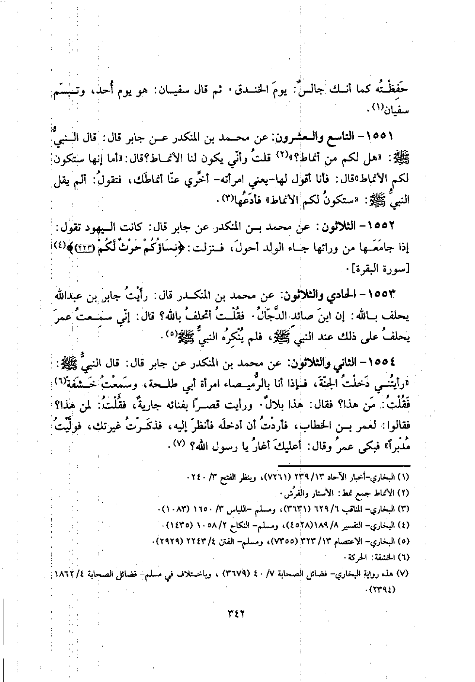 1553 - الْحَادِي وَالثَّلَاثُونَ: عَن مُحَمَّد بن الْمُنْكَدر قَالَ: رَأَيْت جَابر بن عبد الله يحلف بِاللَّه: إِن ابْن صائدٍ الدَّجَّال. فَقلت أتحلف بِاللَّه؟ قَالَ: إِنِّي سَمِعت عمر يحلف على ذَلِك عِنْد النَّبِي صلى الله عَلَيْهِ وَسلم، فَلم يُنكره النَّبِي صلى الله عَلَيْهِ وَسلم.