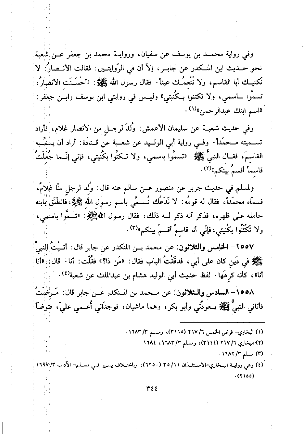 وَفِي رِوَايَة مُحَمَّد بن يُوسُف عَن سُفْيَان، وَرِوَايَة مُحَمَّد بن جَعْفَر عَن شُعْبَة نَحْو حَدِيث ابْن الْمُنْكَدر عَن جَابر، إِلَّا أَن فِي الرِّوَايَتَيْنِ: فَقَالَت الْأَنْصَار: لَا نكنيك أَبَا الْقَاسِم، وَلَا ننعمك عينا. فَقَالَ رَسُول الله صلى الله عَلَيْهِ وَسلم: " أَحْسَنت الْأَنْصَار، تسموا باسمي، وَلَا تكتنوا بكنيتي " وَلَيْسَ فِي روايتي ابْن يُوسُف وَابْن جَعْفَر: " اسْم ابْنك عبد الرَّحْمَن ".