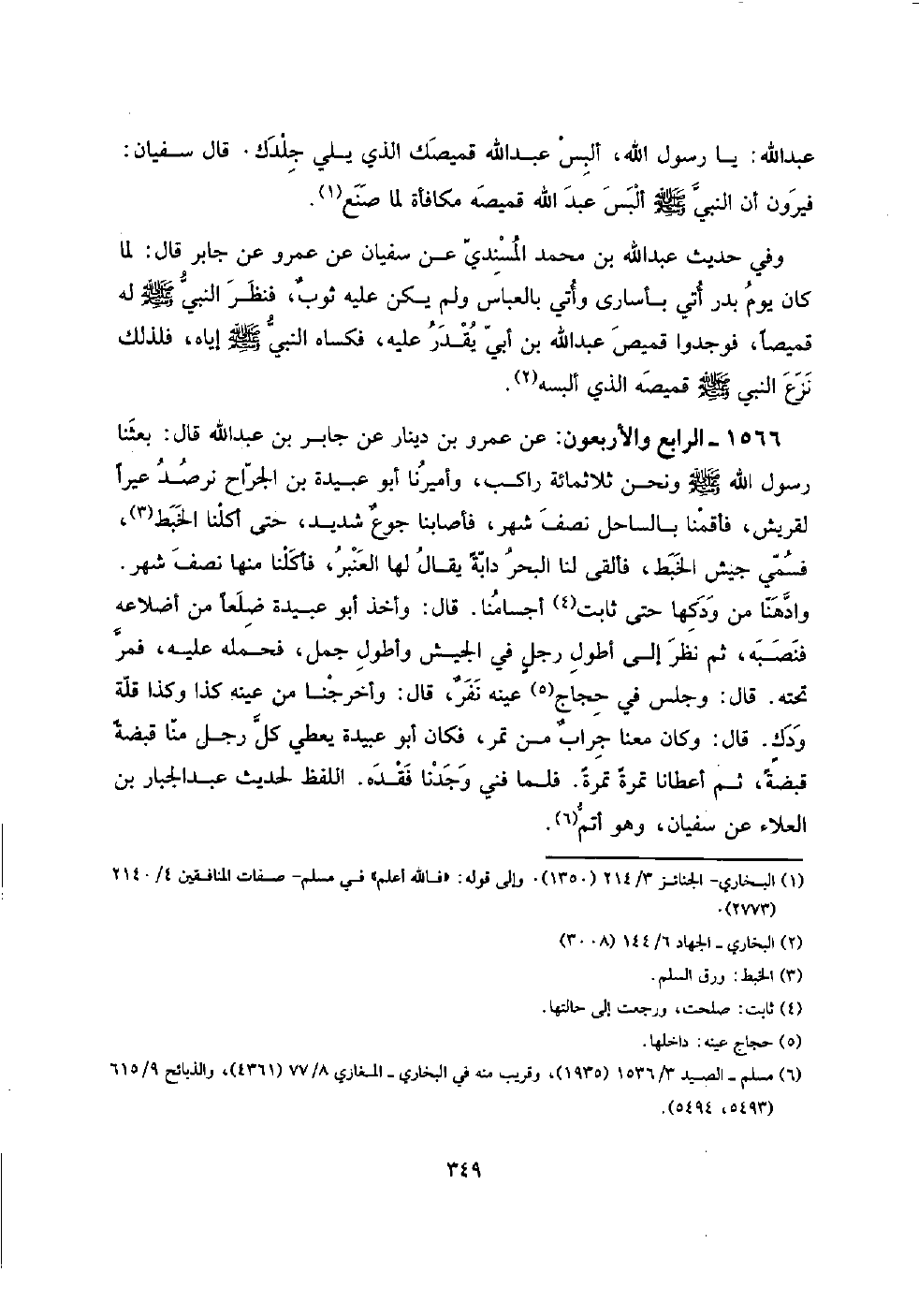 1566 - الرَّابِع وَالْأَرْبَعُونَ: عَن عَمْرو بن دِينَار عَن جَابر بن عبد الله قَالَ: بعثنَا رَسُول الله صلى الله عَلَيْهِ وَسلم وَنحن ثَلَاثمِائَة رَاكب، وأميرنا أَبُو عُبَيْدَة بن الْجراح نرصد عيرًا لقريش، فَأَقَمْنَا بالسَّاحل نصف شهر، فأصابنا جوعٌ شَدِيد، حَتَّى أكلنَا الْخبط، فَسُمي جَيش الْخبط، فَألْقى لنا الْبَحْر دَابَّة يُقَال لَهَا العنبر، فأكلنا مِنْهَا نصف شهر. وادهنا من ودكها حَتَّى ثَابت أجسامنا. قَالَ: وَأخذ أَبُو عُبَيْدَة ضلعاً من أضلاعه فنصبه، ثمَّ نظر إِلَى أطول رجلٍ فِي الْجَيْش وأطول جمل، فَحَمله عَلَيْهِ، فَمر تَحْتَهُ. قَالَ: وَجلسَ فِي حجاج عينه نفرٌ، قَالَ: وأخرجنا من عينه كَذَا وَكَذَا قلَّة ودك. قَالَ: وَكَانَ مَعنا جرابٌ من تمر، فَكَانَ أَبُو عُبَيْدَة يُعْطي كل رجل منا قَبْضَة قَبْضَة، ثمَّ أَعْطَانَا تَمْرَة تَمْرَة. فَلَمَّا فني وجدنَا فَقده. اللَّفْظ لحَدِيث عبد الْجَبَّار بن الْعَلَاء عَن سُفْيَان، وَهُوَ أتم.