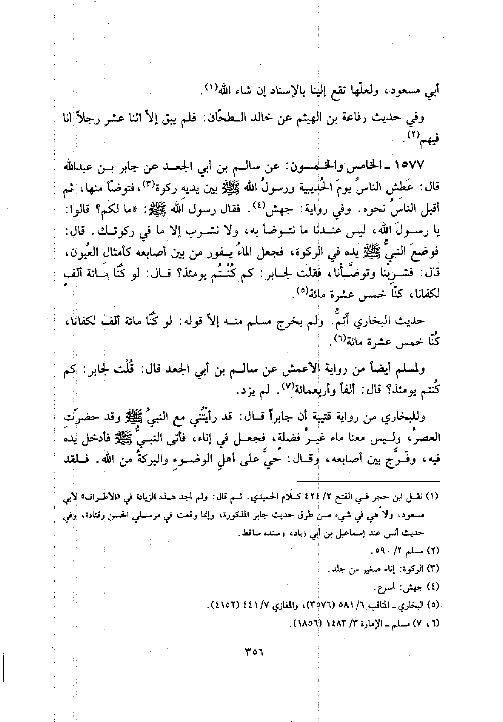 1577 - الْخَامِس وَالْخَمْسُونَ: عَن سَالم بن أبي الْجَعْد عَن جَابر بن عبد الله قَالَ: عَطش النَّاس يَوْم الْحُدَيْبِيَة وَرَسُول الله صلى الله عَلَيْهِ وَسلم بَين يَدَيْهِ ركوة، فَتَوَضَّأ مِنْهَا، ثمَّ أقبل النَّاس نَحوه. وَفِي رِوَايَة: جهش. فَقَالَ رَسُول الله صلى الله عَلَيْهِ وَسلم: " مَا لكم؟ قَالُوا: يَا رَسُول الله، لَيْسَ عندنَا مَا نَتَوَضَّأ بِهِ، وَلَا نشرب إِلَّا مَا فِي ركوتك. قَالَ: فَوضع النَّبِي صلى الله عَلَيْهِ وَسلم يَده فِي الركوة، فَجعل المَاء يفور من بَين أَصَابِعه كأمثال الْعُيُون، قَالَ: فشربنا وتوضأنا، فَقلت لجَابِر: كم كُنْتُم يَوْمئِذٍ؟ قَالَ: لَو كُنَّا مائَة ألفٍ لَكَفَانَا، كُنَّا خمس عشرَة مائَة.