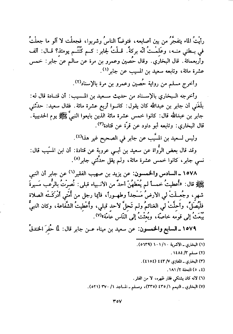رَأَيْت المَاء يتفجر من بَين أَصَابِعه، فَتَوَضَّأ النَّاس وَشَرِبُوا، فَجعلت لَا آلو مَا جعلت فِي بَطْني مِنْهُ، وَعلمت أَنه بركةٌ. قلت لجَابِر: كم كُنْتُم يومئذٍ؟ قَالَ: ألف وَأَرْبَعمِائَة. قَالَ البُخَارِيّ. وَقَالَ حُصَيْن وَعَمْرو بن مرّة عَن سَالم عَن جَابر: خمس عشرَة مائَة، وَتَابعه سعيد بن الْمسيب عَن جَابر.