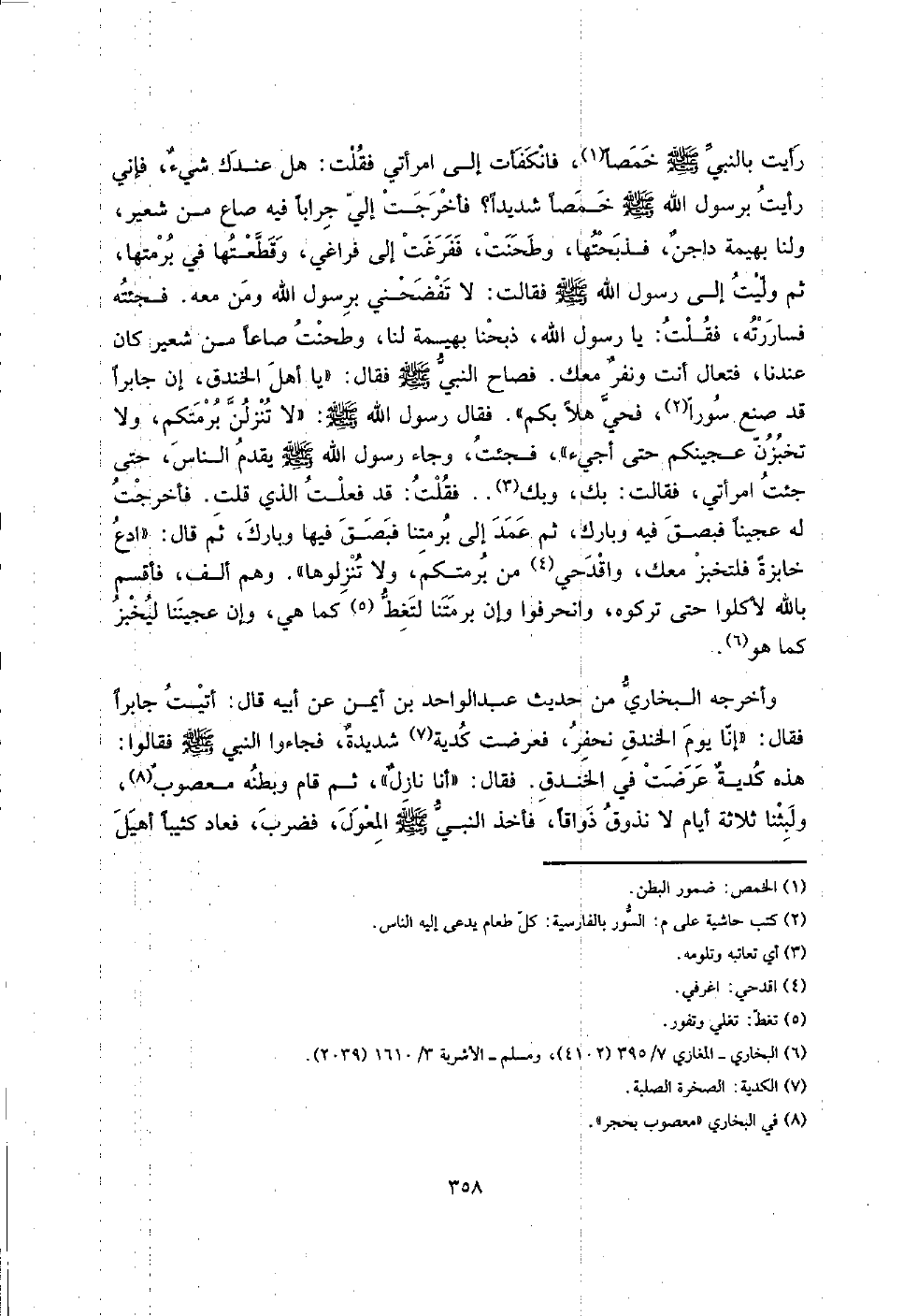 رَأَيْت بِالنَّبِيِّ صلى الله عَلَيْهِ وَسلم خمصاً، فَانْكَفَأت إِلَى امْرَأَتي فَقلت: هَل عنْدك شيءٌ، فَإِنِّي رَأَيْت برَسُول الله صلى الله عَلَيْهِ وَسلم خمصاً شَدِيدا؟ فأخرجت إِلَيّ جراباً فِيهِ صَاع من شعير، وَلنَا بَهِيمَة داجنٌ، فذبحتها، وطحنت، ففرغت إِلَى فراغي، وقطعتها فِي برمتها، ثمَّ وليت إِلَى رَسُول الله صلى الله عَلَيْهِ وَسلم فَقَالَت: