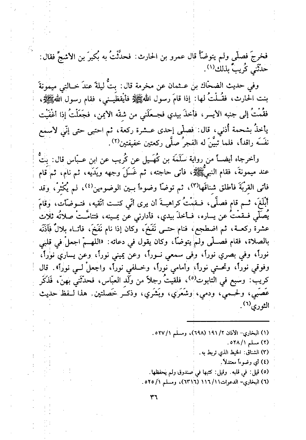 وَأَخْرَجَاهُ أَيْضا من رِوَايَة سَلمَة بن كهيل عَن كريب عَن ابْن عَبَّاس قَالَ: بت عِنْد مَيْمُونَة، فَقَامَ النَّبِي صلى الله عَلَيْهِ وَسلم، فَأتى حَاجته، ثمَّ غسل وَجهه وَيَديه، ثمَّ نَام، ثمَّ قَامَ فَأتى الْقرْبَة فَأطلق شناقها، ثمَّ تَوَضَّأ وضُوءًا بَين الوضوءين، لم يكثر، وَقد أبلغ، ثمَّ قَامَ فصلى، فَقُمْت كَرَاهِيَة أَن يرى أَنِّي كنت أتقيه، فَتَوَضَّأت، وَقَامَ يُصَلِّي فَقُمْت عَن يسَاره، فَأخذ بيَدي، فأدارني عَن يَمِينه، فتتامت صلَاته ثَلَاث عشرَة رَكْعَة، ثمَّ اضْطجع، فَنَامَ حَتَّى نفخ، وَكَانَ إِذا نَام نفخ، فَأَتَاهُ بلالٌ فآذنه بِالصَّلَاةِ، فَقَامَ فصلى وَلم يتَوَضَّأ، وَكَانَ يَقُول فِي دُعَائِهِ: " اللَّهُمَّ اجْعَل فِي قلبِي نورا، وَفِي بَصرِي نورا، وَفِي سَمْعِي نورا، وَعَن يَمِيني نورا، وَعَن يساري نورا، وفوقي نورا، وتحتي نورا، وأمامي نورا، وَخَلْفِي نورا، وَاجعَل لي نورا ". قَالَ كريب: وَسبع فِي التابوت، فَلَقِيت رجلا من ولد الْعَبَّاس، فَحَدثني بِهن، فَذكر عصبي، ولحمي، وَدمِي، وشعري، وبشري، وَذكر خَصْلَتَيْنِ. هَذَا لفظ حَدِيث الثَّوْريّ.