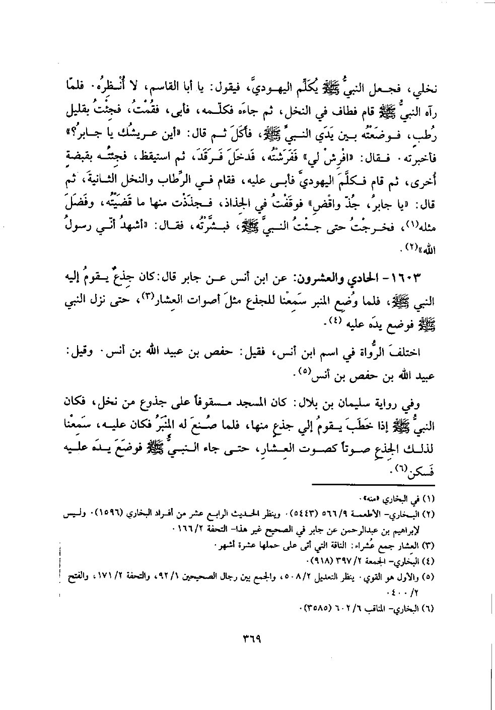 1603 - الْحَادِي وَالْعشْرُونَ: عَن ابْن أنس عَن جَابر قَالَ: كَانَ جذعٌ يقوم إِلَيْهِ النَّبِي صلى الله عَلَيْهِ وَسلم، فَلَمَّا وضع الْمِنْبَر سمعنَا للجذع مثل أصوات العشار، حَتَّى نزل النَّبِي صلى الله عَلَيْهِ وَسلم فَوضع يَده عَلَيْهِ.