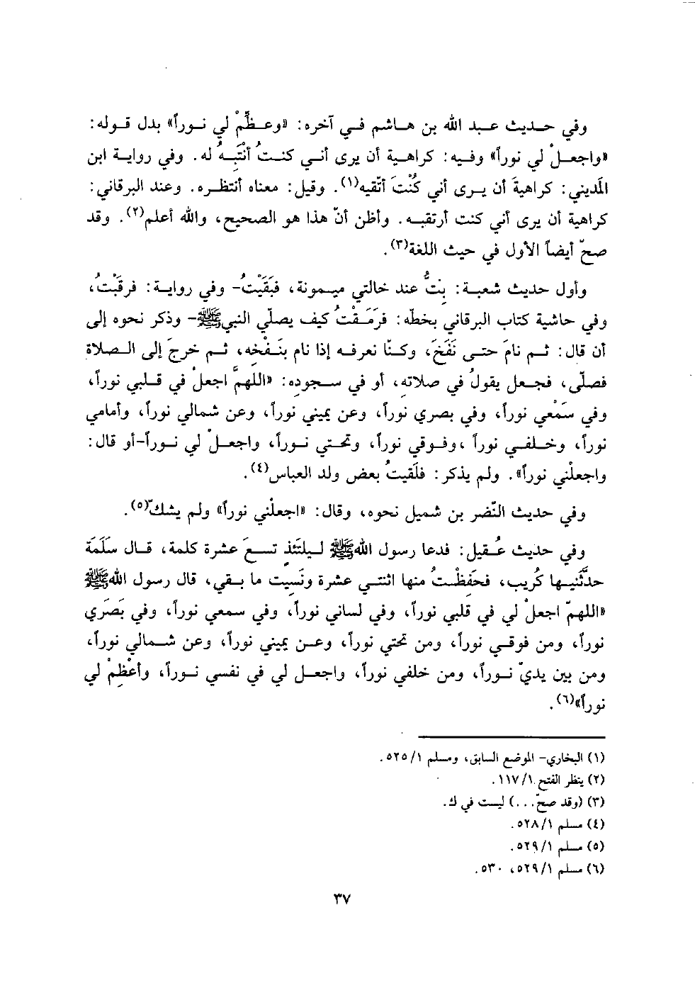 " اللَّهُمَّ اجْعَل فِي قلبِي نورا، وَفِي سَمْعِي نورا، وَفِي بَصرِي نورا، وَعَن يَمِيني نورا، وَعَن شمَالي نورا، وأمامي نورا، وَخَلْفِي نورا، وفوقي نورا، وتحتي نورا، وَاجعَل لي نورا - أَو قَالَ: واجعلني نورا ". وَلم يذكر: فَلَقِيت بعض ولد الْعَبَّاس.