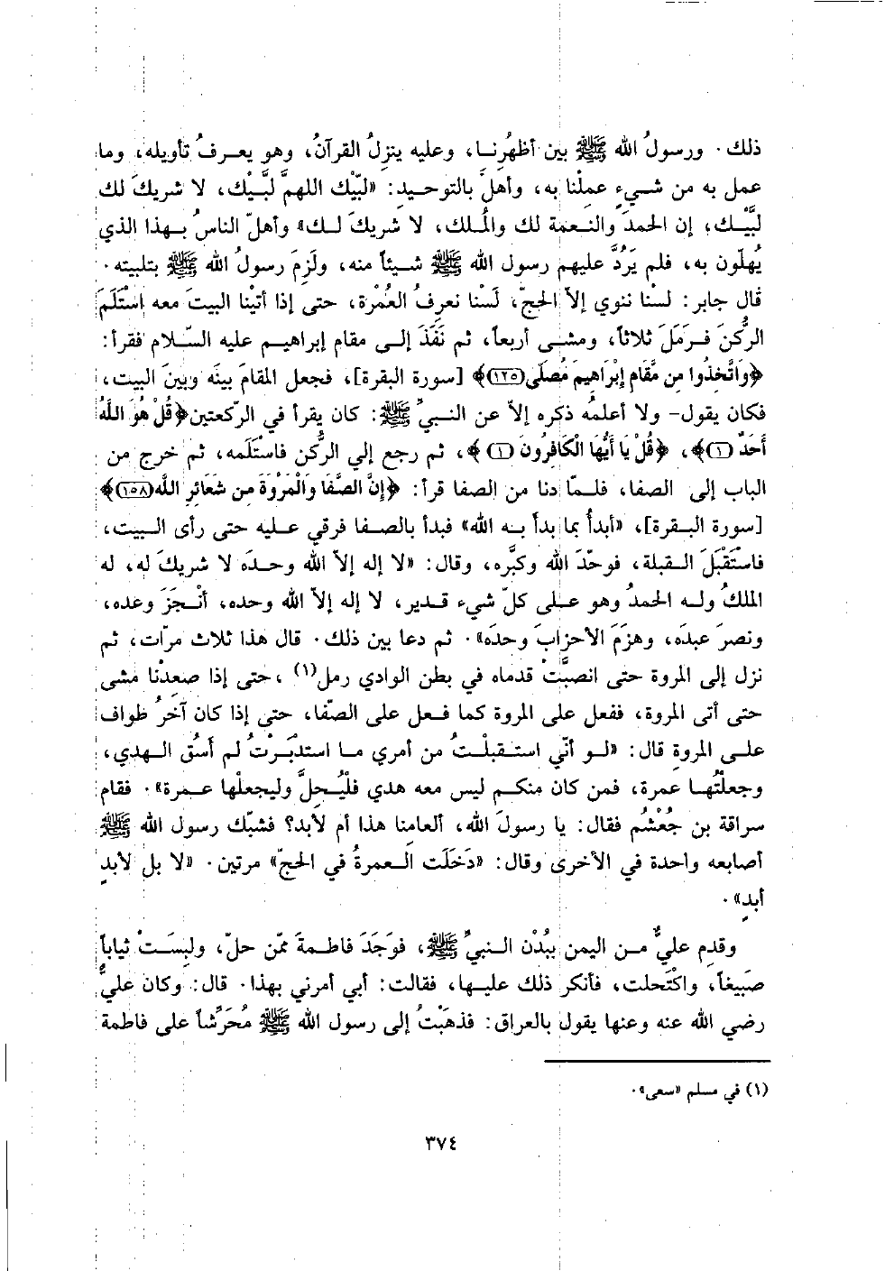 قَالَ جَابر: لسنا ننوي إِلَّا الْحَج، لسنا نَعْرِف الْعمرَة، حَتَّى إِذا أَتَيْنَا الْبَيْت مَعَه اسْتَلم الرُّكْن فَرمَلَ ثَلَاثًا، وَمَشى أَرْبعا، ثمَّ نفذ إِلَى مقَام إِبْرَاهِيم عَلَيْهِ السَّلَام فَقَرَأَ: {وَاتَّخذُوا من مقَام إِبْرَاهِيم مصلى} [سُورَة الْبَقَرَة] ، فَجعل الْمقَام بَينه وَبَين الْبَيْت، فَكَانَ يَقُول - وَلَا أعلمهُ ذكره إِلَّا عَن النَّبِي صلى الله عَلَيْهِ وَسلم: كَانَ يقْرَأ فِي الرَّكْعَتَيْنِ {قل هُوَ الله أحد} ، {قل يَا أَيهَا الْكَافِرُونَ} ، ثمَّ رَجَعَ إِلَى الرُّكْن فاستلمه، ثمَّ خرج من الْبَاب إِلَى الصَّفَا، فَلَمَّا دنا من الصَّفَا قَرَأَ: {إِن الصَّفَا والمروة من شَعَائِر الله} [سُورَة الْبَقَرَة] ، " أبدأ بِمَا بَدَأَ بِهِ الله " فَبَدَأَ بالصفا فرقي عَلَيْهِ حَتَّى رأى الْبَيْت، فَاسْتقْبل الْقبْلَة، فَوحد الله وَكبره، وَقَالَ: " لَا إِلَه إِلَّا الله وَحده لَا شريك لَهُ، لَهُ الْملك وَله الْحَمد وَهُوَ على كل شَيْء قدير، لَا إِلَه إِلَّا الله وَحده، أنْجز وعده، وَنصر عَبده، وَهزمَ الْأَحْزَاب وَحده ". ثمَّ دَعَا بَين ذَلِك. قَالَ هَذَا ثَلَاث مَرَّات، ثمَّ نزل إِلَى الْمَرْوَة حَتَّى انصبت قدماه فِي بطن الْوَادي رمل، حَتَّى إِذا صعدنا مَشى حَتَّى أَتَى الْمَرْوَة، فَفعل على الْمَرْوَة كَمَا فعل على الصَّفَا، حَتَّى إِذا كَانَ آخر طواف على الْمَرْوَة قَالَ: " لَو أَنِّي اسْتقْبلت من أَمْرِي مَا اسْتَدْبَرت لم أسق الْهَدْي، وجعلتها عمْرَة، فَمن كَانَ مِنْكُم لَيْسَ مَعَه هدي فليحل وليجعلها عمْرَة ". فَقَامَ سراقَة بن جعْشم فَقَالَ: يَا رَسُول الله، ألعامنا هَذَا أم لأبد؟ فشبك رَسُول الله صلى الله عَلَيْهِ وَسلم أَصَابِعه وَاحِدَة فِي الْأُخْرَى وَقَالَ: " دخلت الْعمرَة فِي الْحَج " مرَّتَيْنِ. " لَا بل لأبدٍ أبدٍ ".